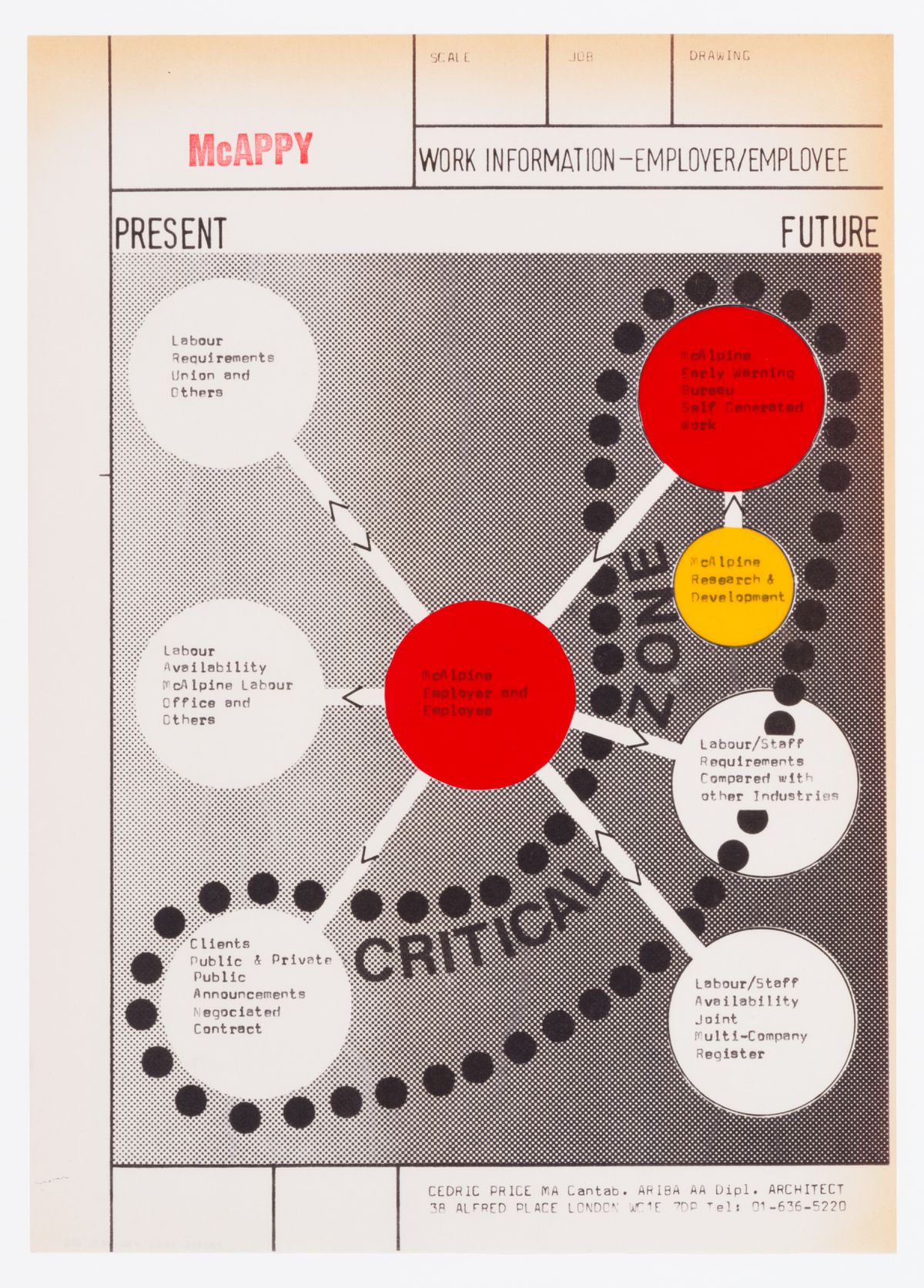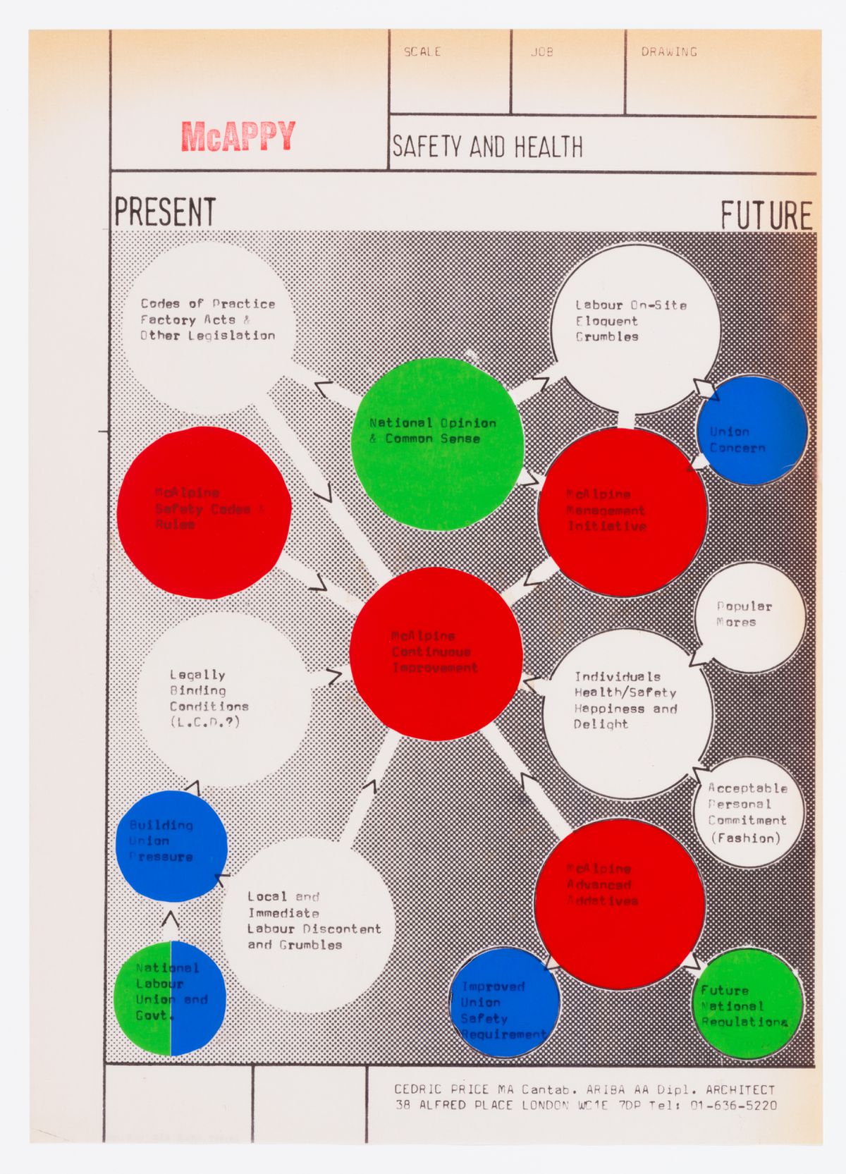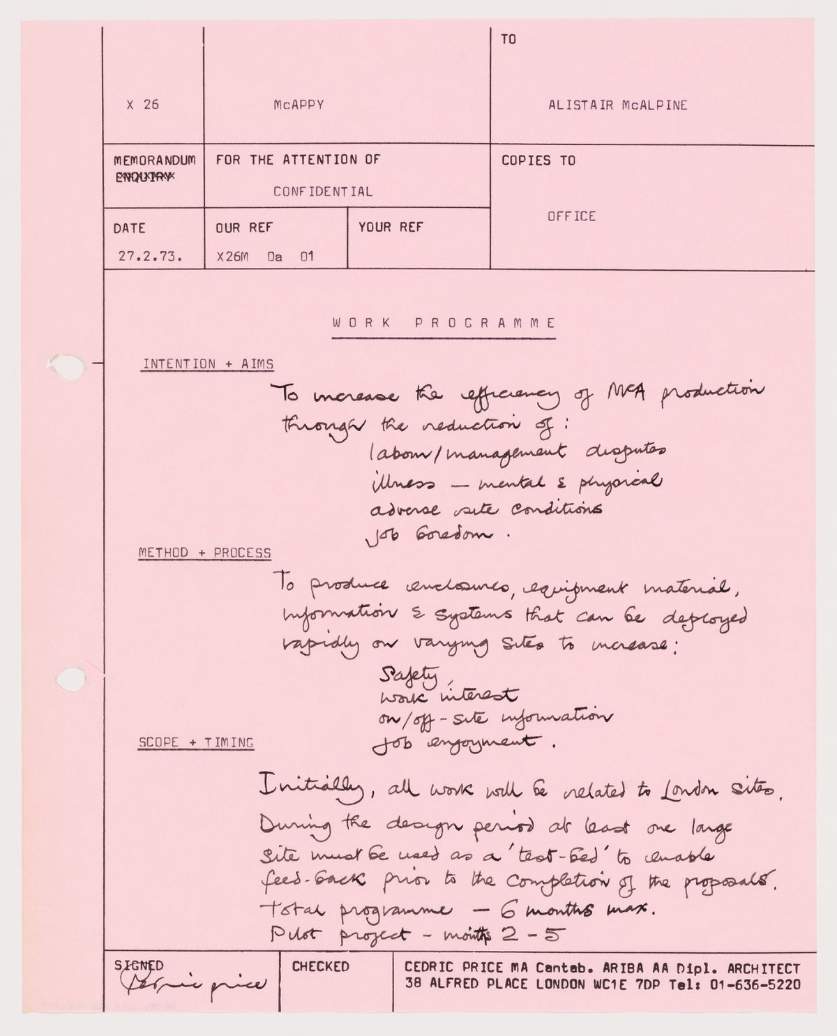 In 1973, following the strikes that beset the British construction industry during the early 1970s, Alistair McAlpine commissioned a design program for his construction company, Sir Robert McAlpine & Sons, that aimed to increase production efficiency and improve labour relations. Cedric Price’s proposal took the format of a two-volume report and a Portable Enclosures Programme (PEP) which, while presenting a critical view of building sites, also demonstrated his ambition to go beyond the immediate brief, employing architectural knowledge and thoughtful design to respond to pressing societal issues and human necessities.