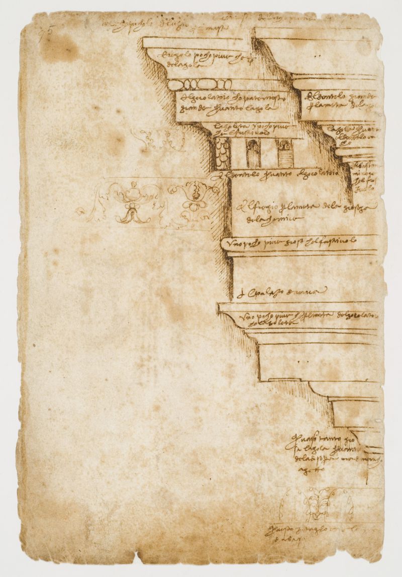 In the Codex Barberini and the Taccuino Senese (c. 1465-1516), Giuliano da Sangallo made the first thorough attempt to document the monuments of Rome. Falling between the medieval model book and the printed architectural treatise, both chronologically and conceptually, his drawings defy conventional classification and explanation. They represent a unique moment of intersection between a poetic and analytic engagement with Rome, manifesting both Giuliano’s nostalgia for the lost splendor of Rome and his impulse as a practicing architect to collect principles and models. The coincidence of these interests—which would later divide into the pictorial view (veduta) and the architectural drawing—may be read in the layers of information he includes, from his painstaking wash rendering of the weathering of the stone and his invocations of a fantasy ruined landscape, to his carefully measured and orthogonally represented architectural details.