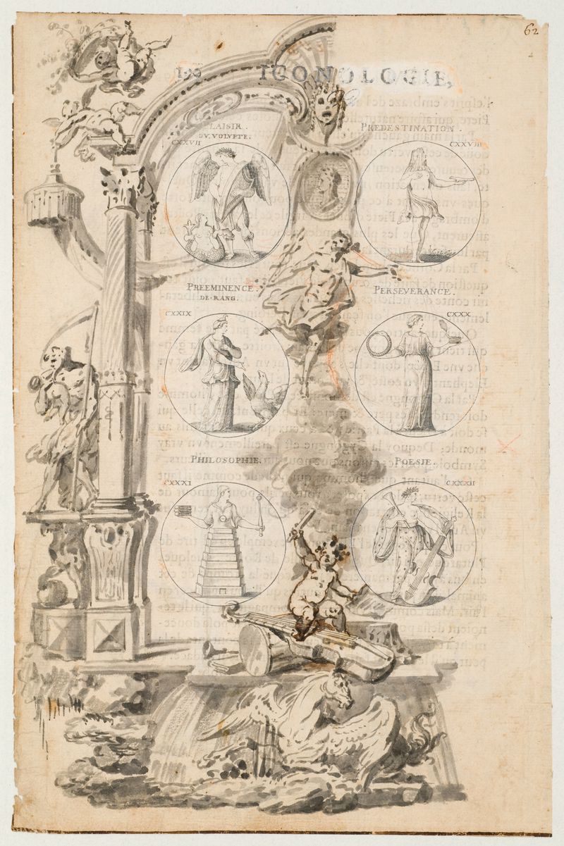 Directeur général des bâtiments of the duc d’Orléans, the Regent, Oppenord was at the center of French architectural practice of his time. As made evident by this sketchbook, his consummate draftsmanship, praised by his contemporaries and coveted by collectors, exceeded by far the practical demands usually required of architects. On a copy of the first French edition of Cesare Ripa’s Iconologia, published by Jean Baudoin in 1636 with engravings by Jacques de Bié, Oppenord drew vignettes, head and tail pieces, borders and other ornamental motifs. This unique object sheds light on the practice of ornament design in early eighteenth-century France, a period famous for its inventiveness in interior decoration. These experiments, called by contemporaries the “goût moderne,” are known today, somewhat reductively, as the Rococo.