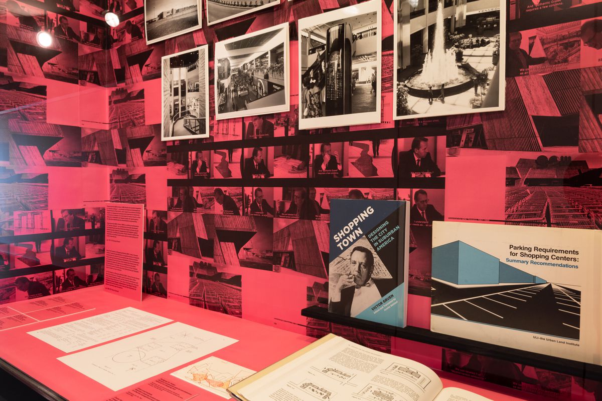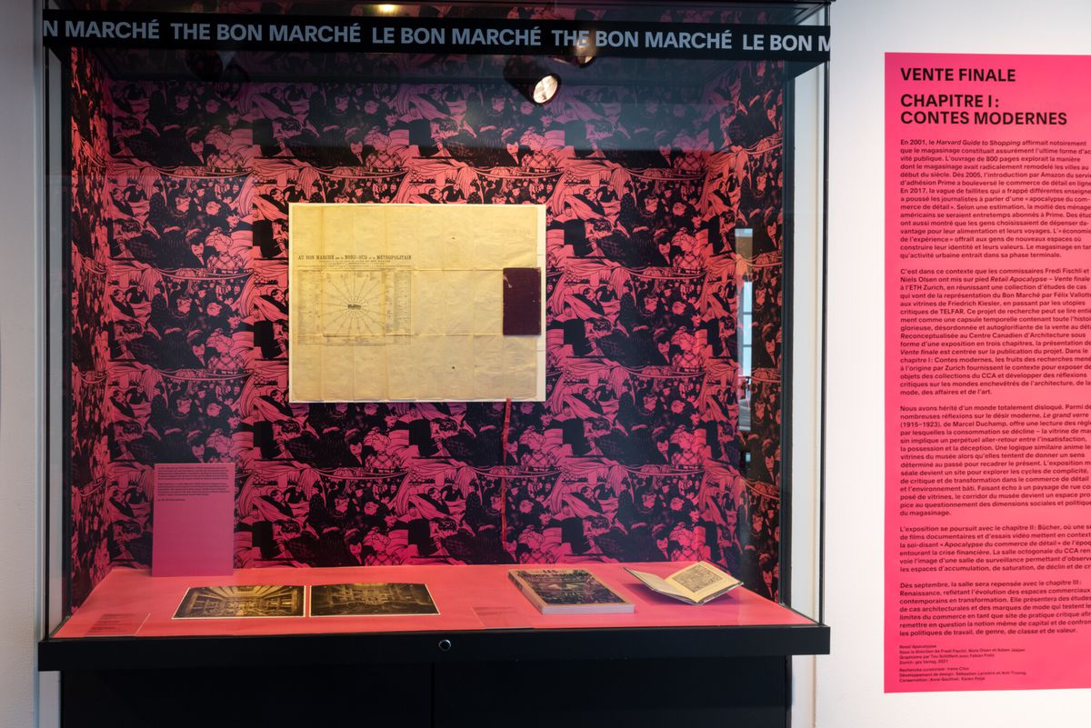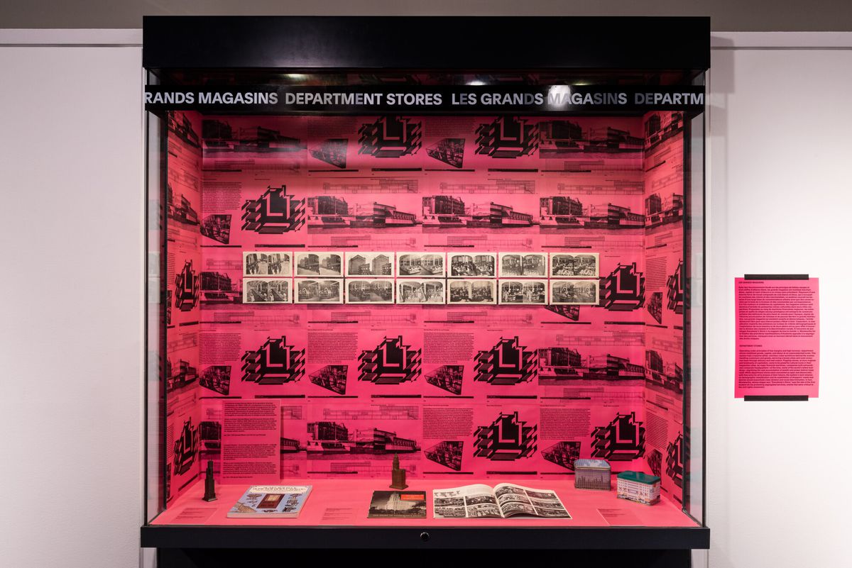 In Chapter I: Modern Tales, pages of the ETH publication line the CCA’s Hall Cases, recalling the provisional blackout of shop windows with final sale posters. The scenography developed with graphic designer Teo Schifferli destabilizes the conventional museum vitrine to produce a dialogical display of critical case studies and CCA Collections objects. Artefacts—including souvenir models, commercial catalogues, and consumer surveys—demonstrate how integral retail architecture has been in shaping cities and landscapes, organizing class and culture, and influencing individual and social behaviour.