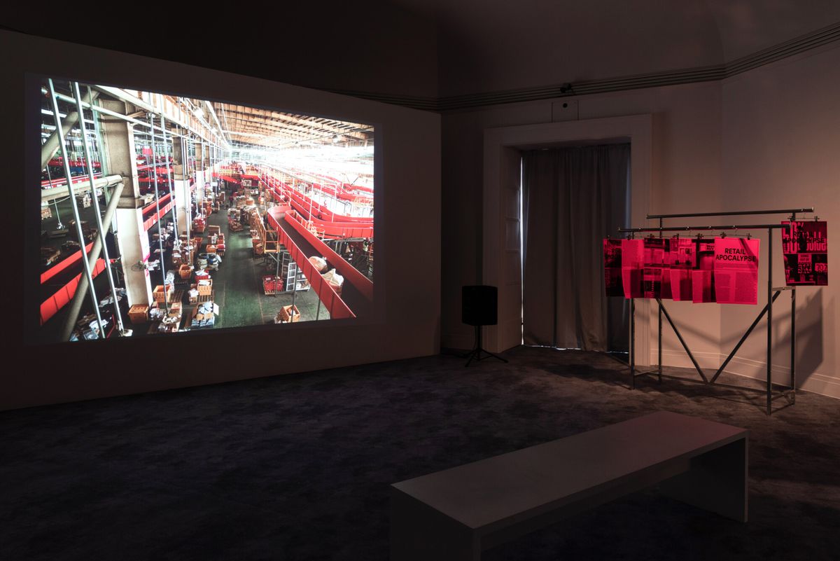The exhibition continues with Chapter II: Bonfire, where documentary films and video essays depict the spectacular collapse of retail as a pillar of civic life. Dan Bell’s Dead Mall series portrays the architectural and societal decay of shopping, while Cao Fei and Andreas Angelidakis present the ever-growing world of distribution by e-commerce. Steel Cities documents the architecture of logistics in Central and Eastern Europe, focusing on workers’ lives to contradict the mute appearance of infrastructure often described as posthuman. Bernadette Corporation and Hannah Black focus on the political aspects of dehumanization as it relates to capitalist acceleration, presenting possible forms of resistance—through acts of protest and looting—despite a collective sense of helplessness.