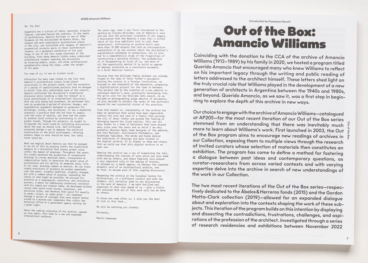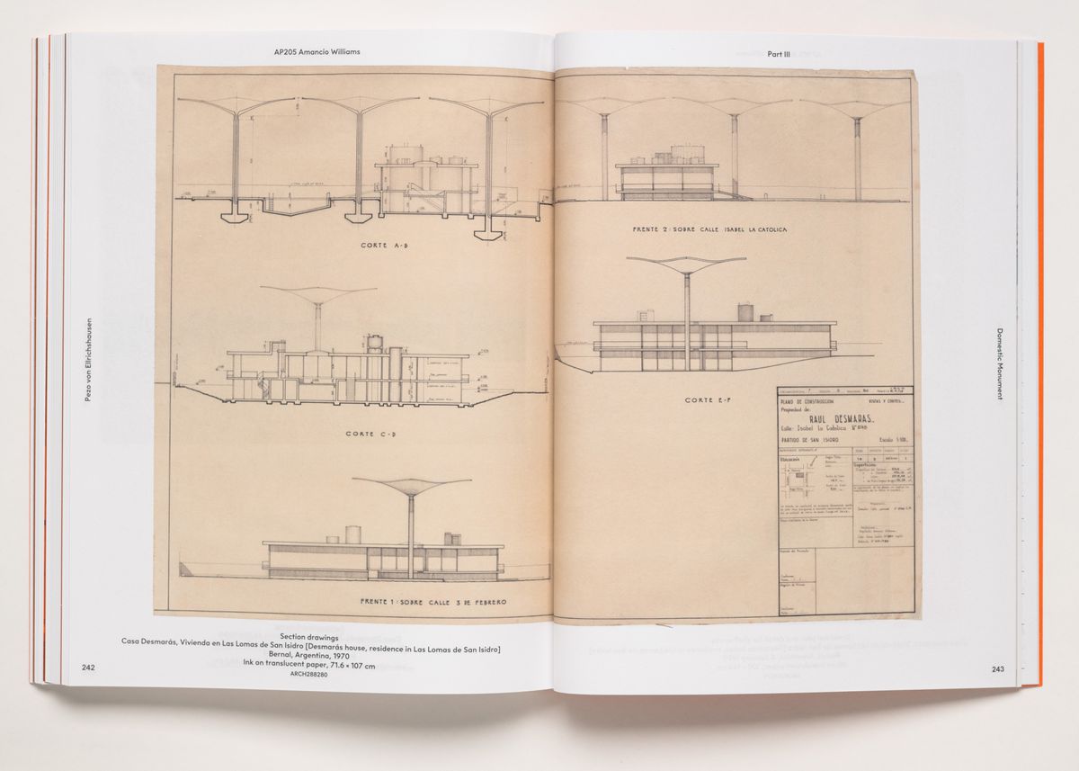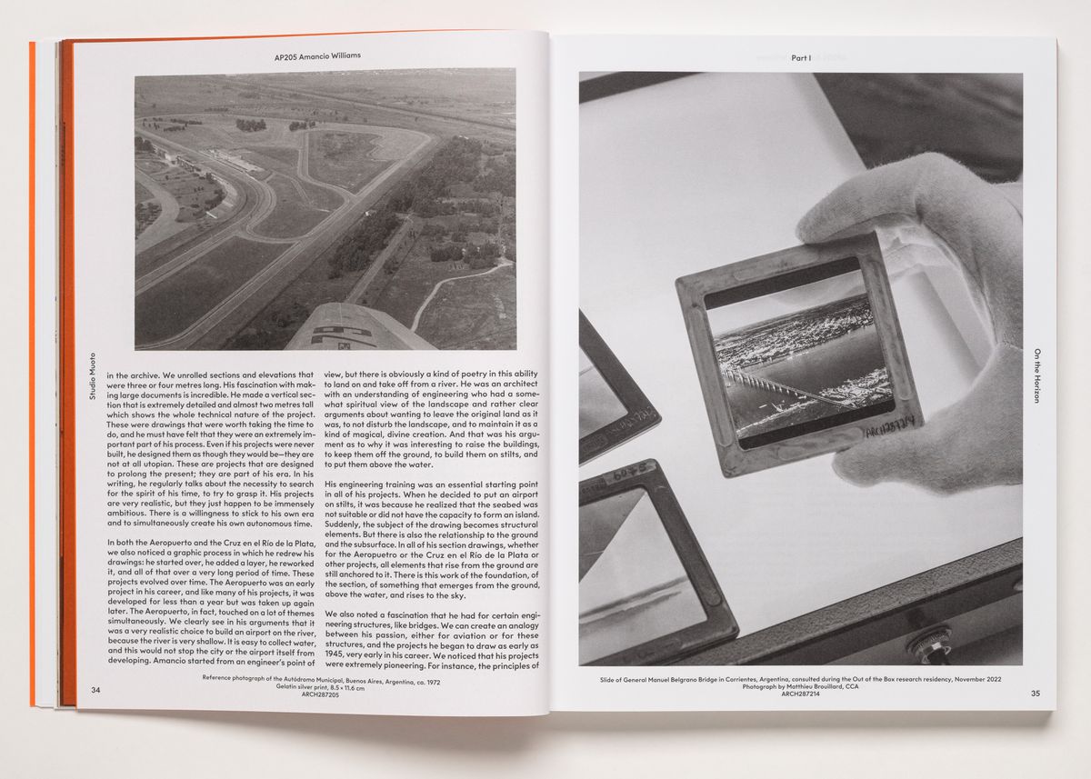 AP205 Amancio Williams is dedicated to the work of Argentinian architect Amancio Williams (1913‒1989), one of the key figures of modern architecture in Latin America. The vast output of projects and proposals produced by his office from the 1940s‒1980s is evidenced through an expansive archive of drawings, photographs, correspondence, and models, donated to the Canadian Centre for Architecture by the Williams family in 2020. The publication features research by Studio Muoto, Claudia Shmidt, and Pezo von Ellrichshausen, who each possess distinct backgrounds in architectural practice and history. Together, their readings present new and expanded understandings of Williams’s work, and situate the social, material, and political dimensions of his practice within contemporary architecture discourse.