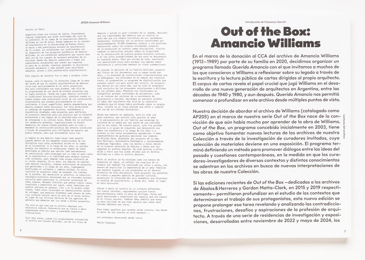 AP205 Amancio Williams está dedicada a la obra del arquitecto argentino Amancio Williams (1913-1989), una de las figuras más influyentes de la arquitectura moderna en América Latina. La vasta producción de proyectos y propuestas producidas por su oficina entre las décadas de 1940 y 1980 se evidencia a través de un amplio archivo de dibujos, fotografías, correspondencia y modelos, donados al CCA por la familia Williams en 2020. Juntos, lecturas de Studio Muoto, Claudia Shmidt y Pezo von Ellrichshausen presentan comprensiones nuevas y ampliadas del trabajo de Williams y sitúan las dimensiones sociales, materiales y políticas de su práctica dentro del discurso de la arquitectura contemporánea.
