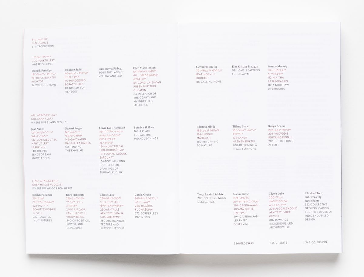 With contributions from Robyn Adams, Ella den Elzen, Liisa-Rávná Finbog, Napatsi Folger, Carola Grahn, Jenni Hakovirta, Elin Kristine Haugdal, Geronimo Inutiq, Ellen Marie Jensen, Tanya Lukin Linklater, Nicole Luke, Reanna Merasty, Johanna Minde, Joar Nango, Taqralik Partridge, Jocelyn Piirainen, Naomi Ratte, Tiffany Shaw, Sunniva Skålnes, Jen Rose Smith, and Olivia Lya Thomassie