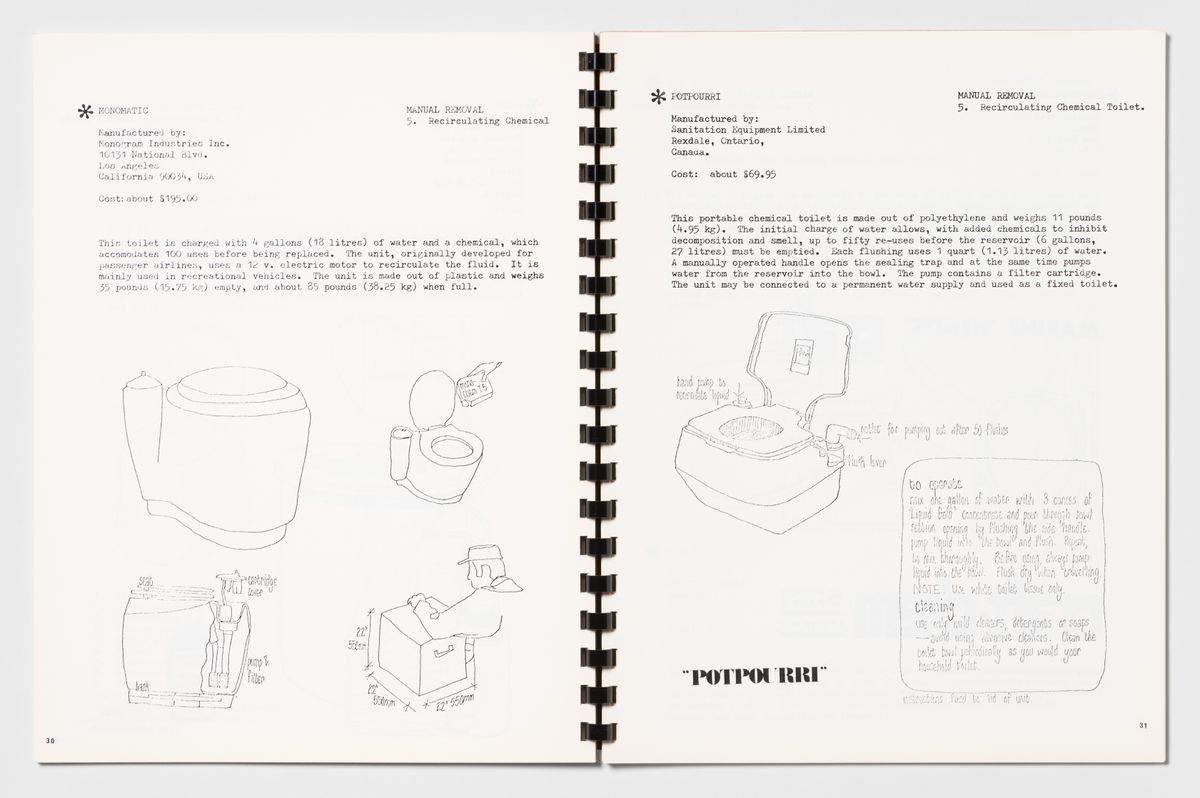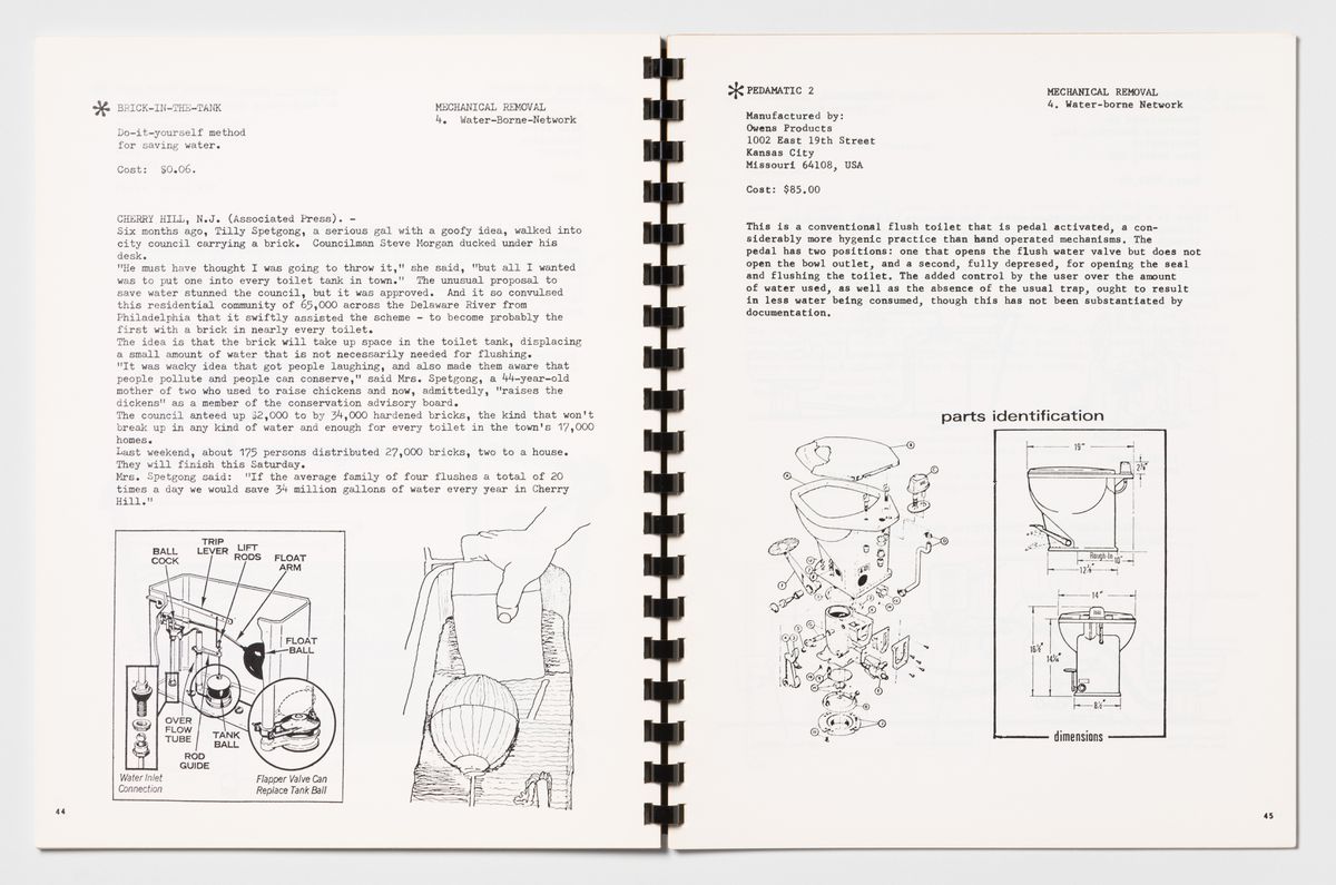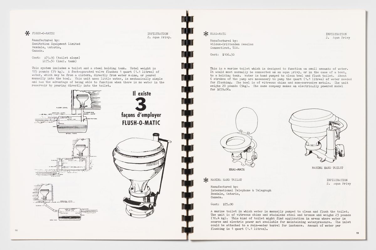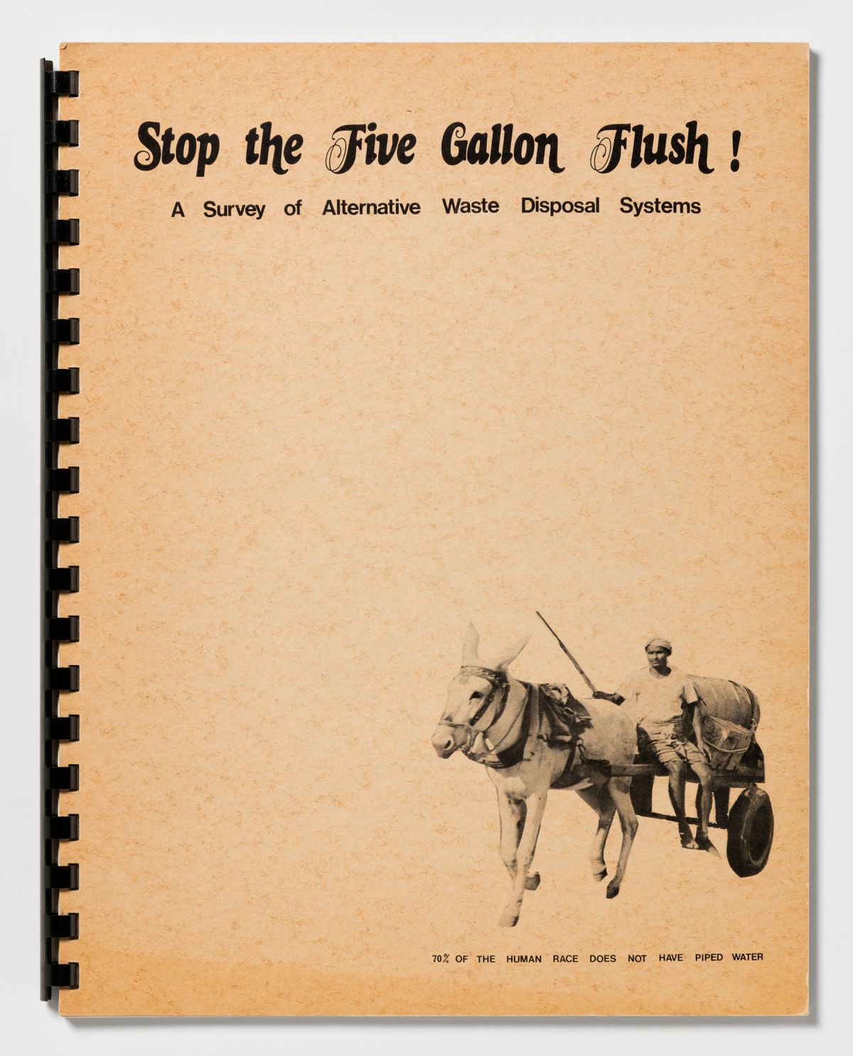 Stop the Five Gallon Flush! bridged the worlds of international development research, the appropriate technology movement, countercultural lifestyle publishing, and ecological design. Such was its success that the initial edition quickly sold out. Thirteen hundred copies had been sold by 1975, when a revised and expanded edition was printed (the MCHG archive at the CCA holds a copy of this reprint). Stop the Five Gallon Flush! would go on to sell around six thousand copies purely via mail order, and it heralded a wave of pamphlets and books that advocated alternative sanitation systems. These included the Rodale organization’s Goodbye to the Flush Toilet (1977), the Swedish International Development Authority’s Sanitation Without Water (1978), and Sim Van der Ryn’s “classic” The Toilet Papers (1978).