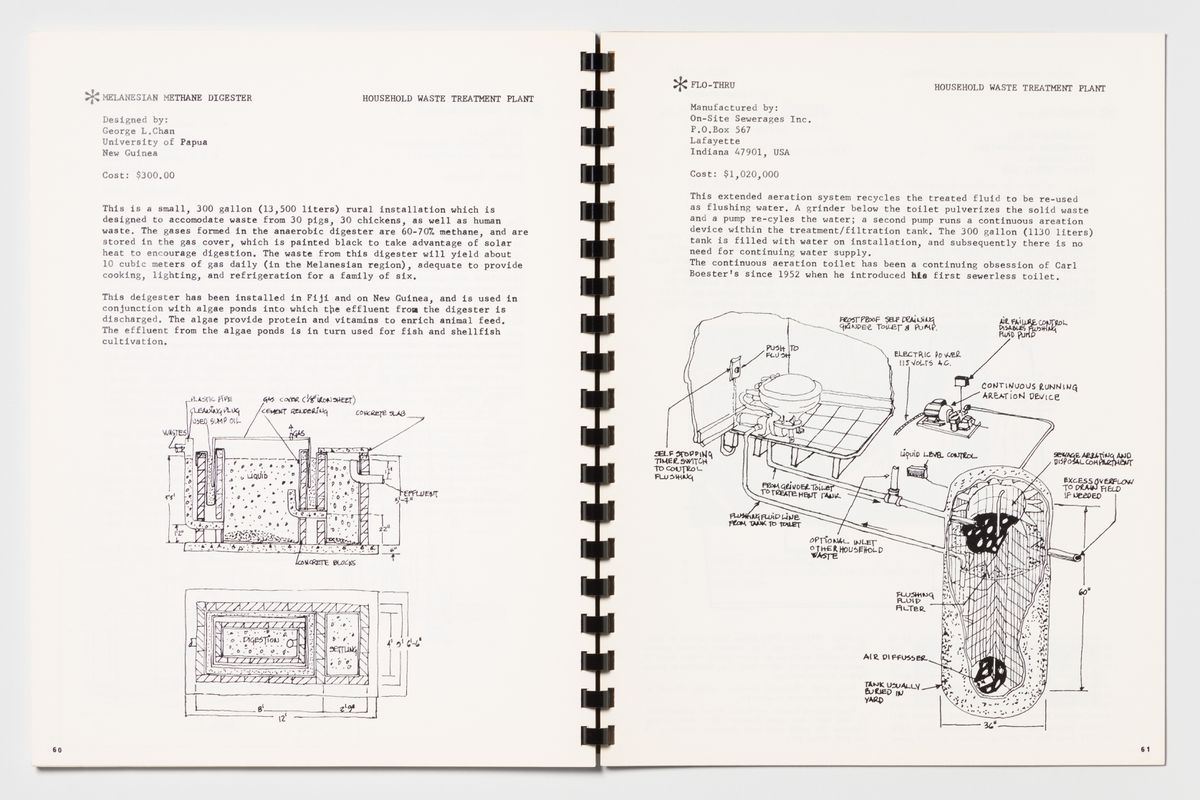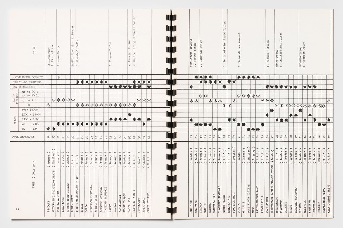 Does your toilet flush? How much water does it use? Where does your waste go? Rethinking the infrastructuring of the domestic was a priority for ecological designers in the 1970s. Even the seemingly banal technology of the toilet was closely scrutinized for its environmental, economic, social, and political implications. The modern flush toilet, linked to an industrial sewage treatment system, had become the convenient, conventional option in the developed world. However, the problems of its capital-intensive production and infrastructure, its excessive use of resources (particularly water), and the environmental impact of waste-water outflows were also becoming apparent.