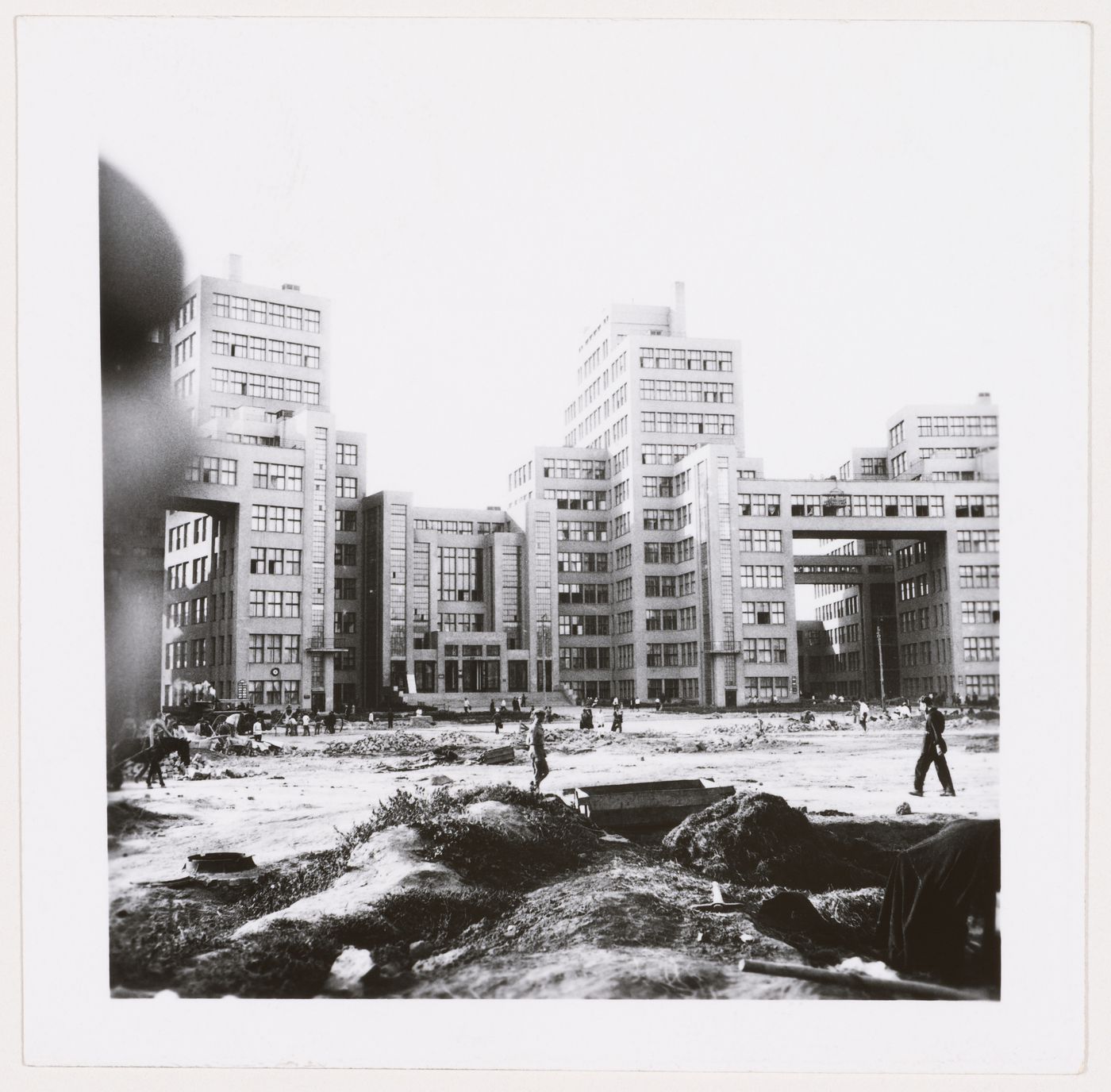 Exterior view of the Department of Industry and Planning (Gosprom) buildings showing Dzerzhinskaya Square under construction, Kharkov, Soviet Union (now in Ukraine)