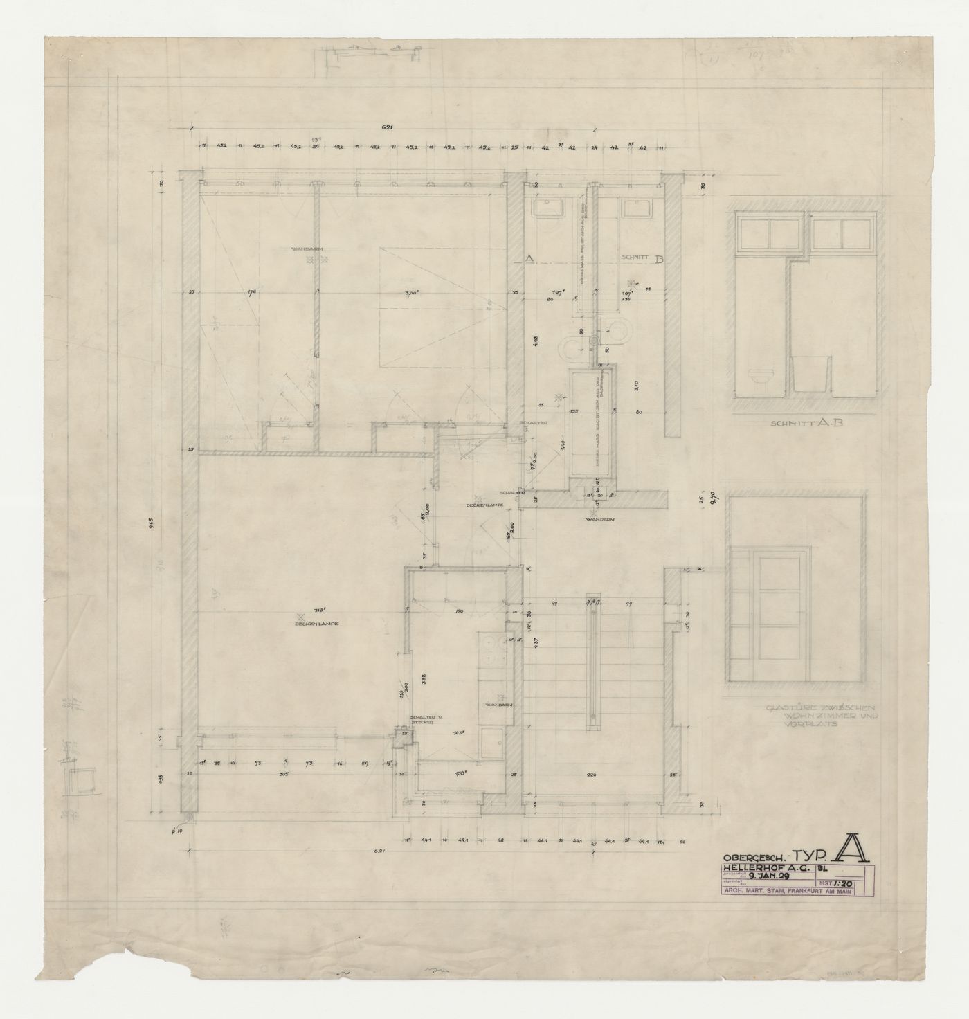 stamped - in purple ink, l.r.: "fertiggestellt / den [with date] / abgeändert / den [blank space] MST. [with scale] / ARCH.MART.STAM, FRANKFURT AM MAIN" inscribed and dated - by the draughtsman, in pen and black ink, l.r.: "OBERGESCH TYP. A" and "HELLERHOF A.G. BL / 9.JAN.29 / [with scale]" [within stamp]; and throughout: with dimensions inscribed - by the draughtsman, in graphite, c.r.: with section orientation; and throughout: with dimensions and specifications