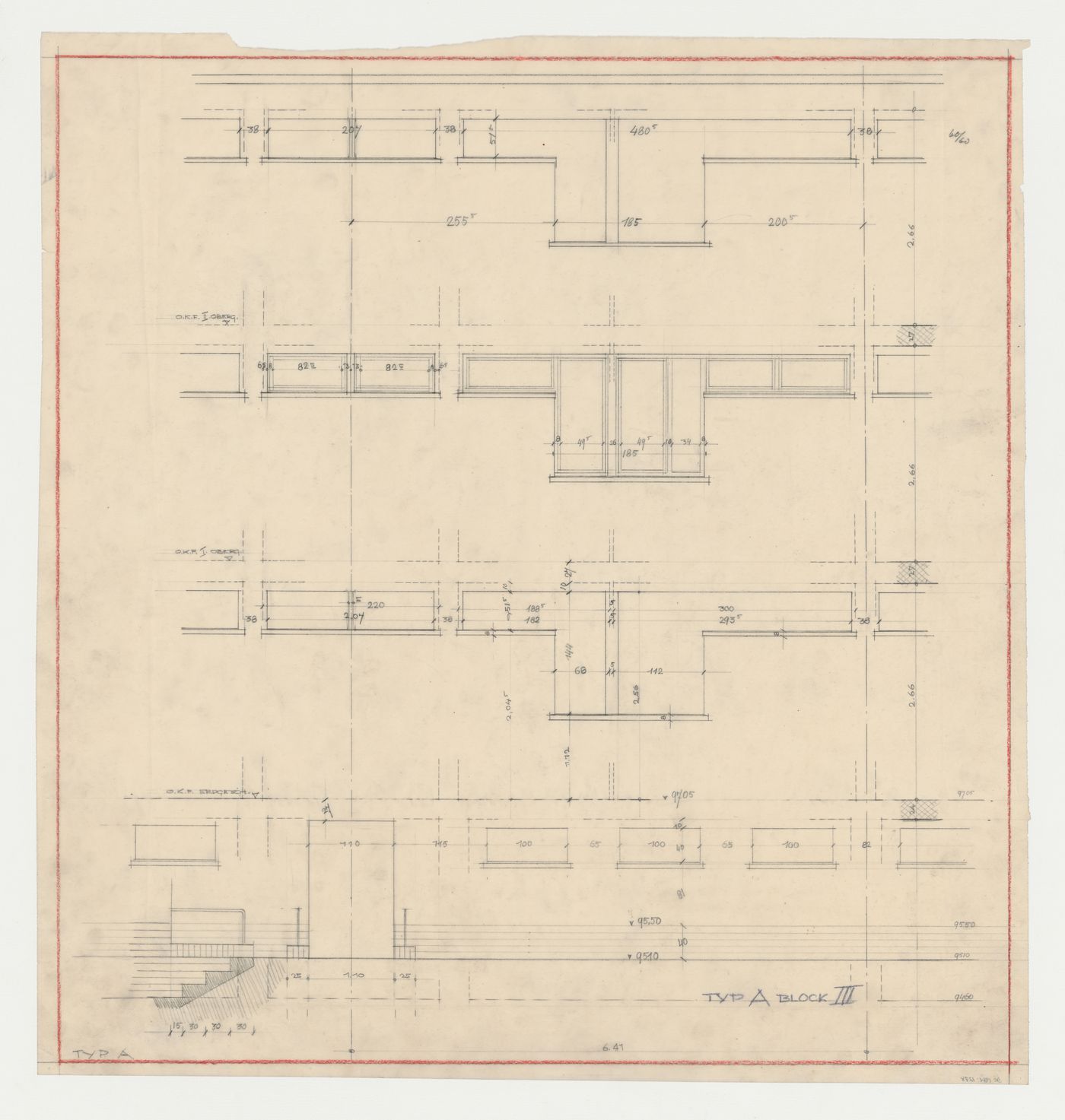 inscribed - by the draughtsman, in purple ink, l.r.: "TYP A BLOCK III" inscribed - by the draughtsman, in graphite, l.l.: "TYP A"; and throughout with dimensions and specifications inscribed - by an unknown hand, in graphite, u.r.: "60//60"