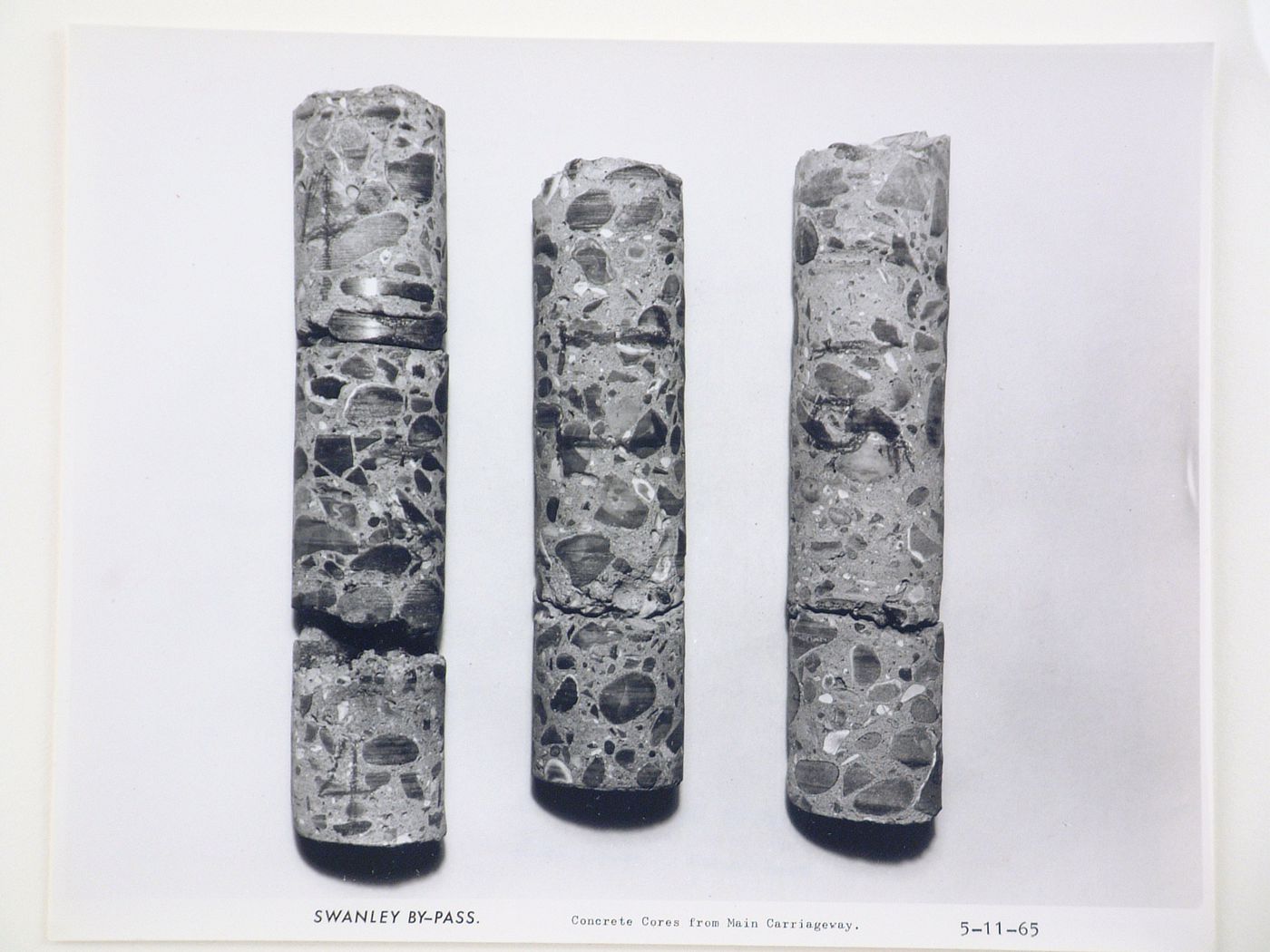 inscribed - in black ink, on recto, below image: "SWANLEY BY-PASS. Concrete Cores from Main Carriageway. 5-11-65" stamped - on verso, l.c.: [in blue ink:] "ARCHIE HANDFORD LTD. / [in red ink:] 62. GEORGE STREET. CROYDON" / [in blue ink:] Phone: CRO. 0821 No........... [handwritten in graphite:] 49188B"