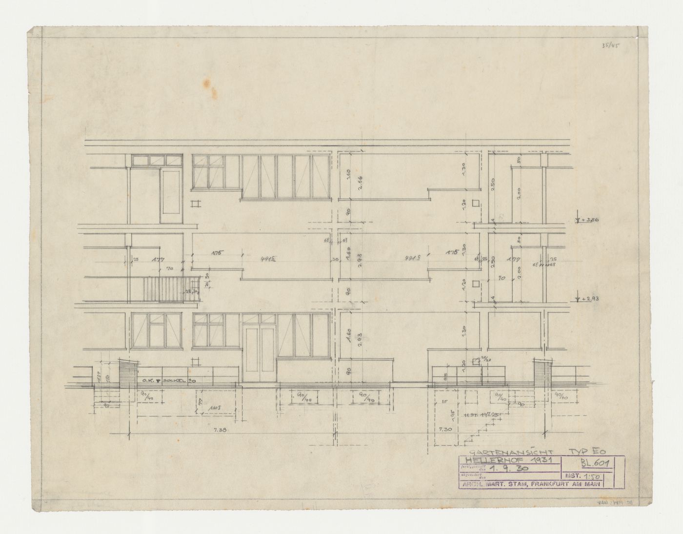 stamped - in purple ink, l.r.: "fertiggestellt / den [with date and drawing number] / abgeändert / den [blank space] MST. [with scale] / ARCH.MART.STAM, FRANKFURT AM MAIN" inscribed - by an unknown hand, in graphite, u.r.: "35//45" inscribed, numbered and dated - by the draughtsman, in graphite, l.r.: "GARTENANSICHT TYP EO / HELLERHOF 1931 [within stamp] / BL.601 / 1.9.30 [within stamp] / [with scale within stamp]"; and throughout: with dimensions