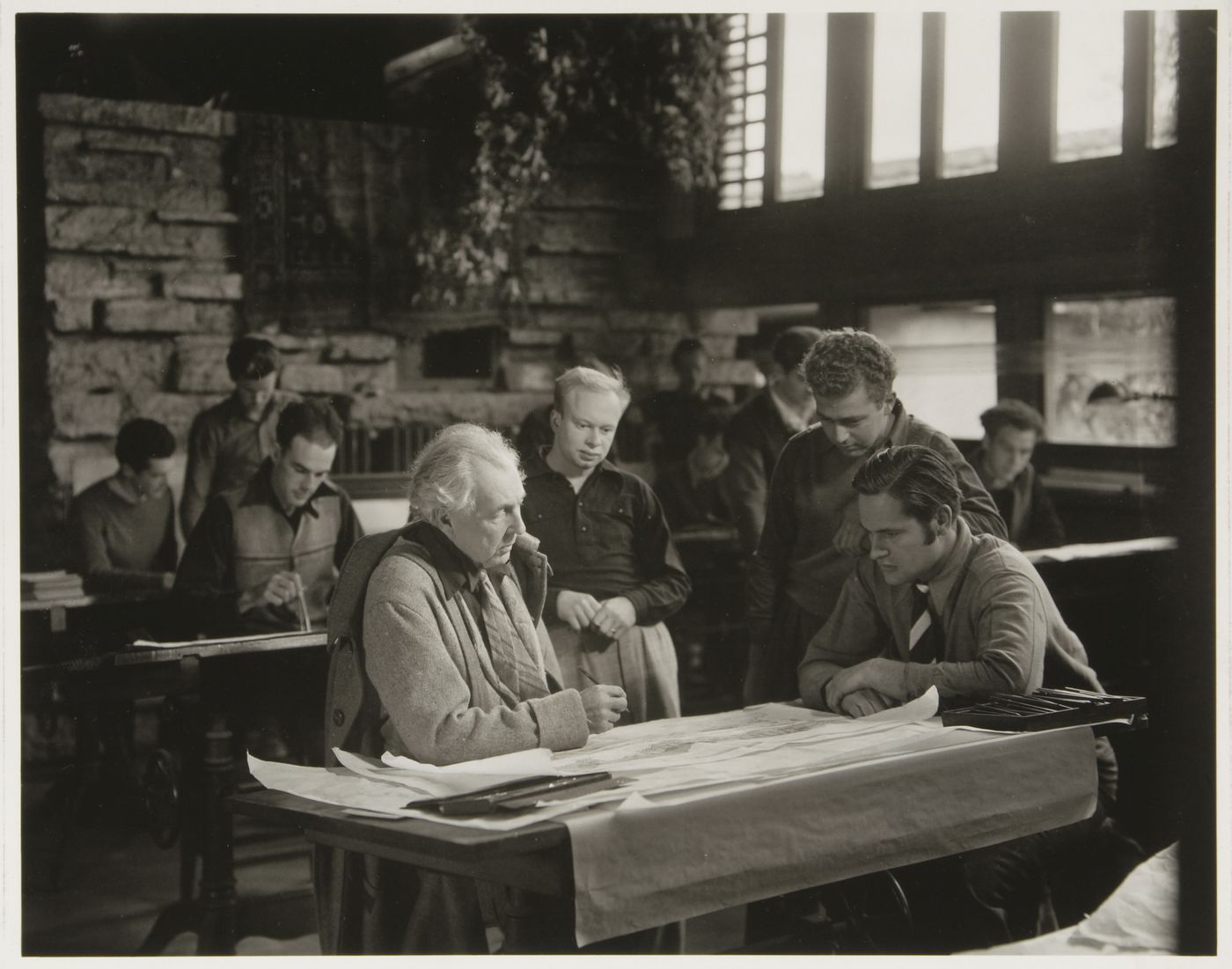 Frank Lloyd Wright, with a group of Taliesin Fellow, Taliesin Studio, Spring Green, Wisconsin