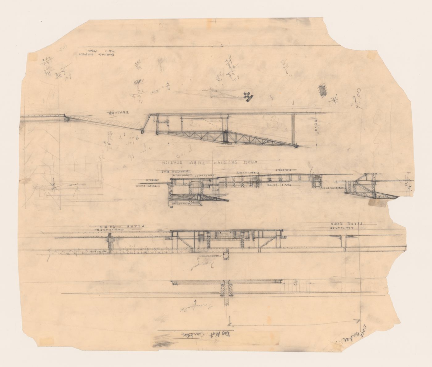 - In organization, presentation, scale and in most details this drawing corresponds to the lower half of the submitted competition panel (DR1987:0359) for which it is a preparatory drawing. Inscriptions at upper left and upper centre are instructions to the draughtsman (possibly himself) who would transfer these drawings to the panel. There are several small changes made in the submitted panel but the most noticeable is the section of the plane shed concourse.