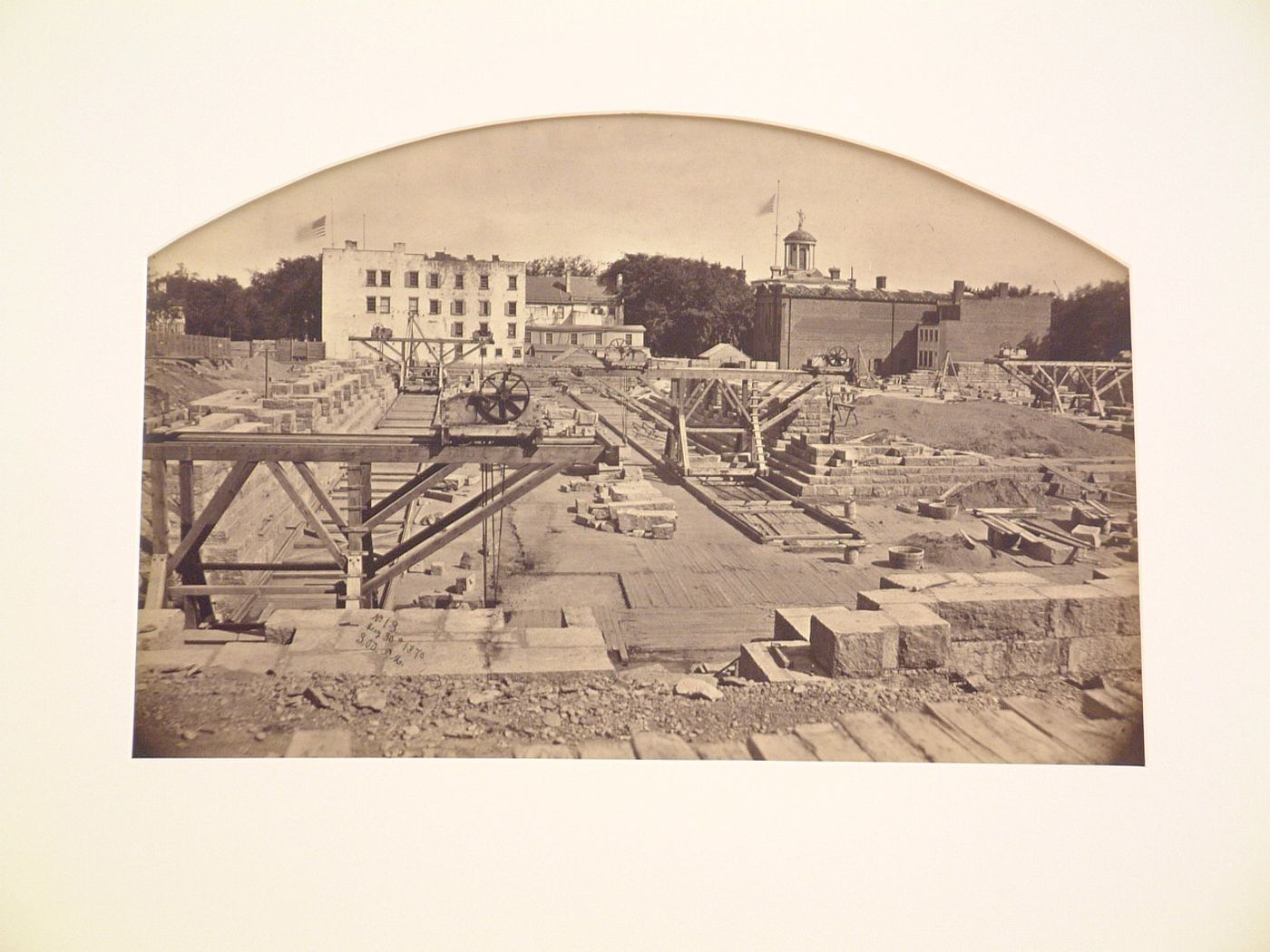 inscribed - HAINES, Photo., ALBANY N.Y. (printed in ink, on mount, recto, LL, LR); CONDITION OF THE WORK ON THE NEW CAPITOL, AT ALBANY, N.Y./PHOTOGRAPH NO... .......18. (printed in ink, on mount, recto, LC); 19 3:00 P.M. May 30th .....70 (in pencil, in unknown hand, on mount, following "NO." in inscription); No.19./May 30th 1870./3:00 p.m. (scratched into negative in unknwon hand, on print, recto, LL)