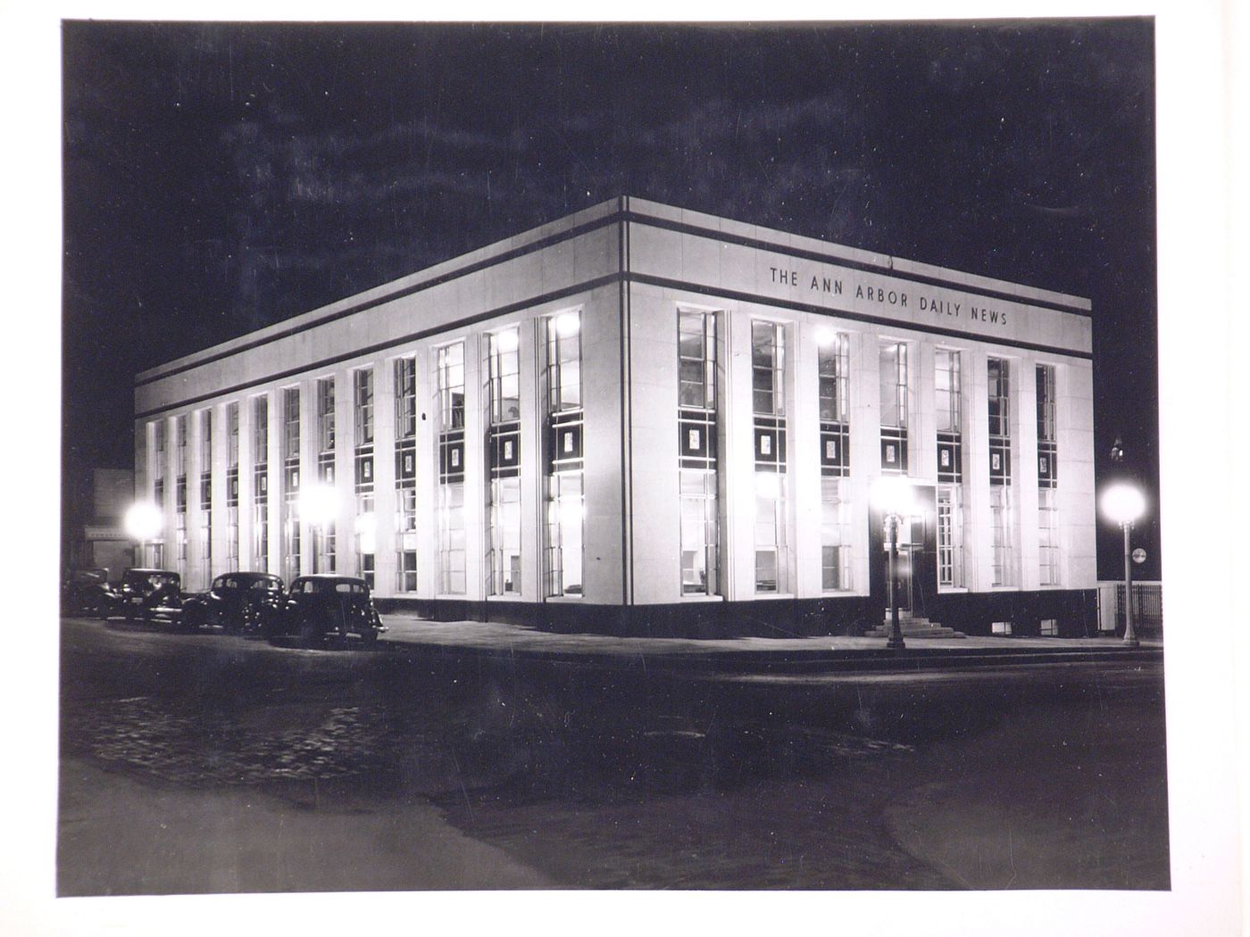View of the principal and lateral façades of the Ann Arbour Daily News Building at night, Detroit, Michigan