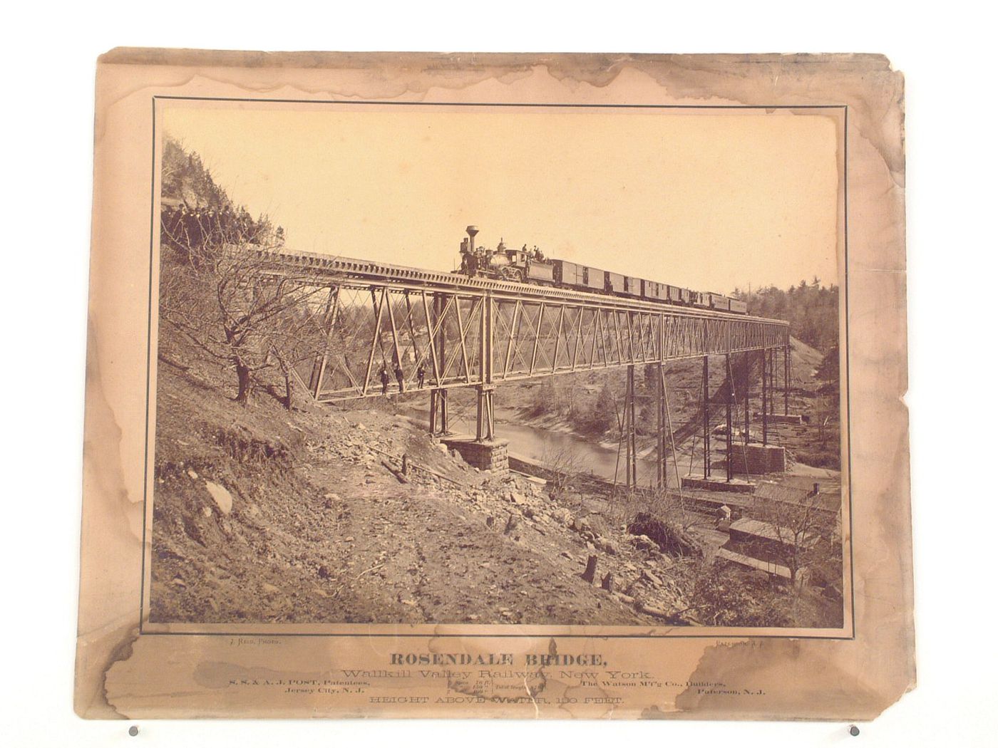 imprinted - in typescript and black ink, on the secondary support, l.l.: "J. REID, PHOTO.,"; l.r.: "PATERSON, N.J."; l.c.: with title and / "Wallkill Valley Railway, New York." / with bridge measurements / "Total Length 876 ft. / HEIGHT ABOVE WATER, 150 FEET." imprinted - in typescript and black ink, on the secondary support, l.l.: S.S. & A.J. POST, Patentees, / Jersey City, N.J."; l.r.: "The Watson M'f'g Co., Builders, / Paterson, N.J." inscribed, dated and numbered - by an unknown hand, in graphite, on the secondary support, verso, u.r.: "W / 35- [scribbled out] / DG / @1870" / with a price / "W / 20" [faint]; l.l.: "@1870 / date [illeg.] photo [Zhidgo?]" [upside down]