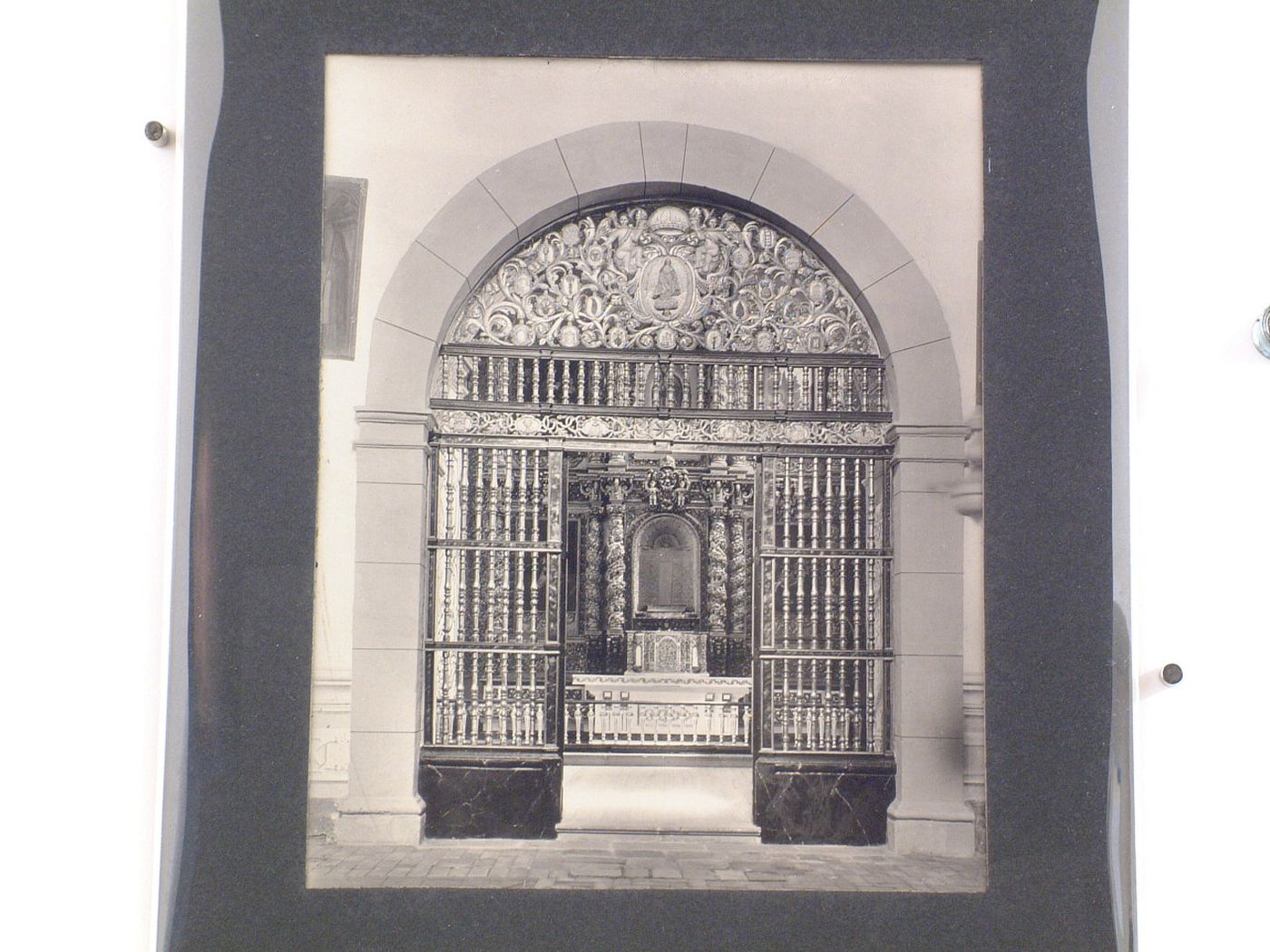 labelled and imprinted - in typescript and black ink, on a paper label attached to the secondary support, verso, l.c.: "NUMBER (...) VOLUME", and with title, historical information on the subject pictured on the photograph, and reference to the series titled 'The Spanish Colonial Architecture in Mexico'