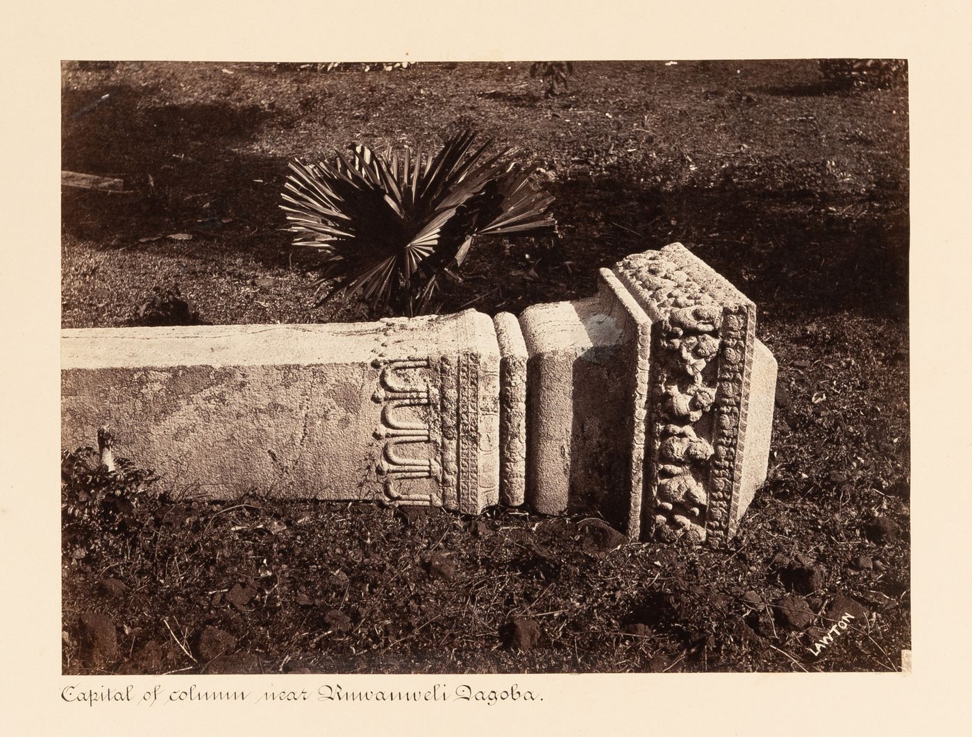Close-up view of a column with reliefs, near the Ruwanweli Seya (also known as Rumwanweli Dagoba and Rumanweli Maha Seya), Anuradhapura, Ceylon (now Sri Lanka)