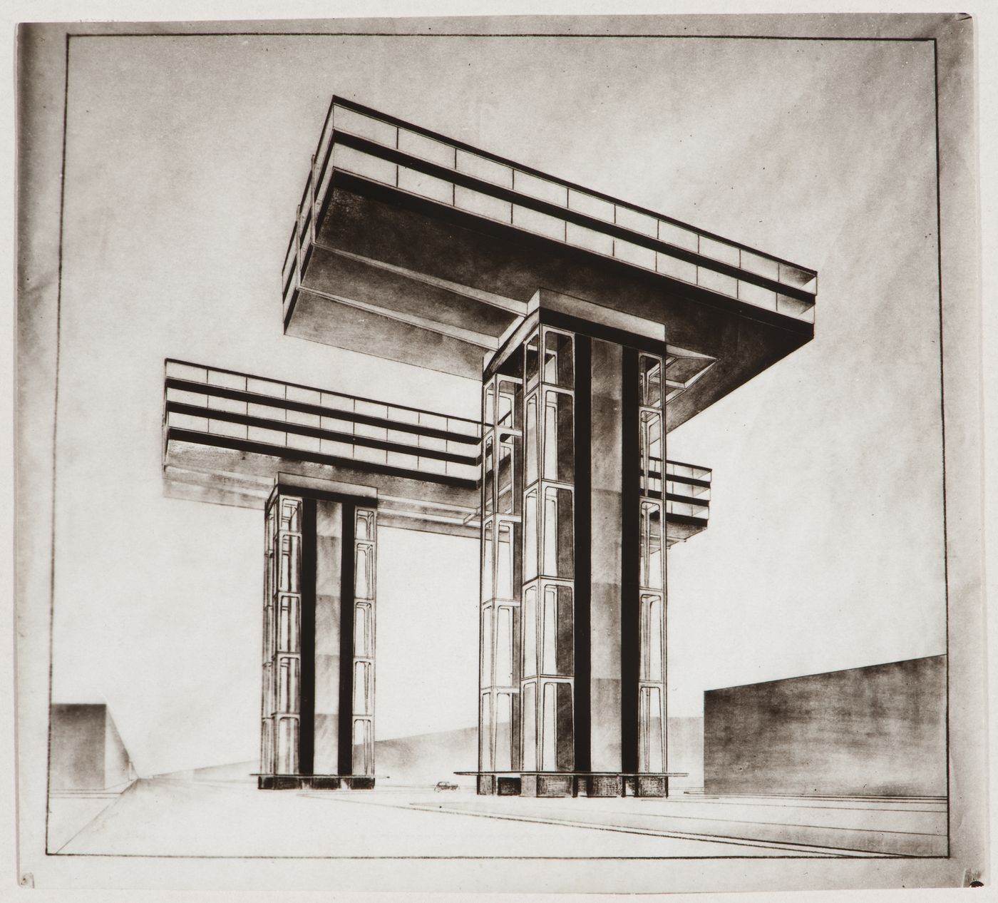 Photograph of a perspective drawing for Horizontal Skyscrapers (Cloudprop), Nikitsky Square, Moscow