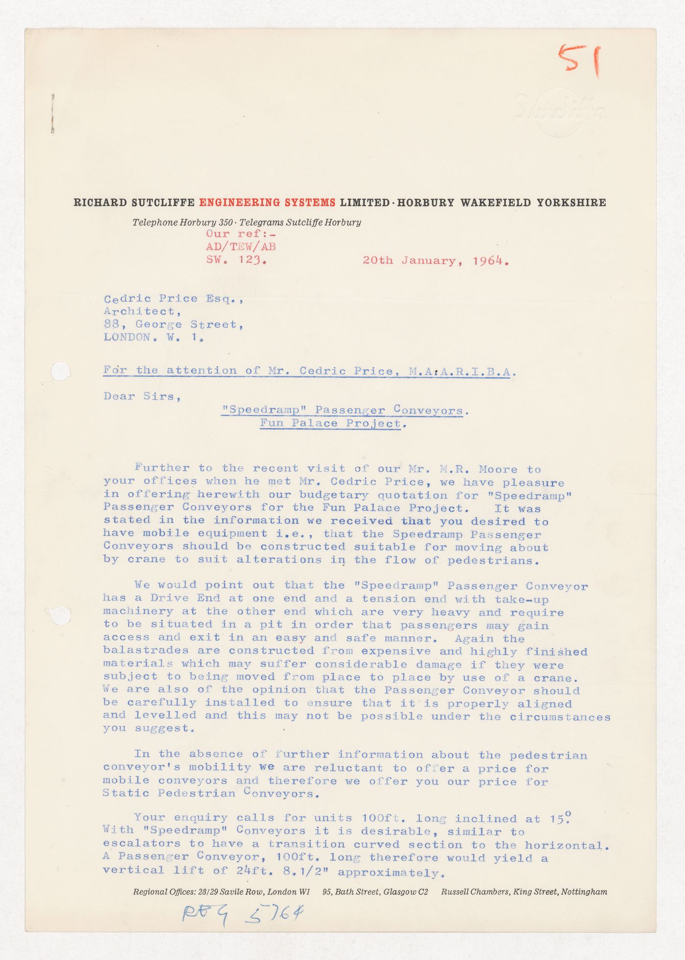 Letter from Richard Sutcliffe Engineering Systems Limited to Cedric Price
