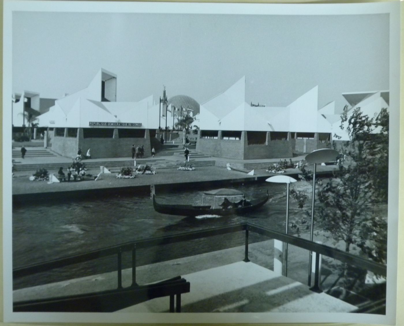 Partial view of the Africa place and the Democratic Republic of the Congo Pavilion with a gondola in foreground, Expo 67, Montréal, Québec
