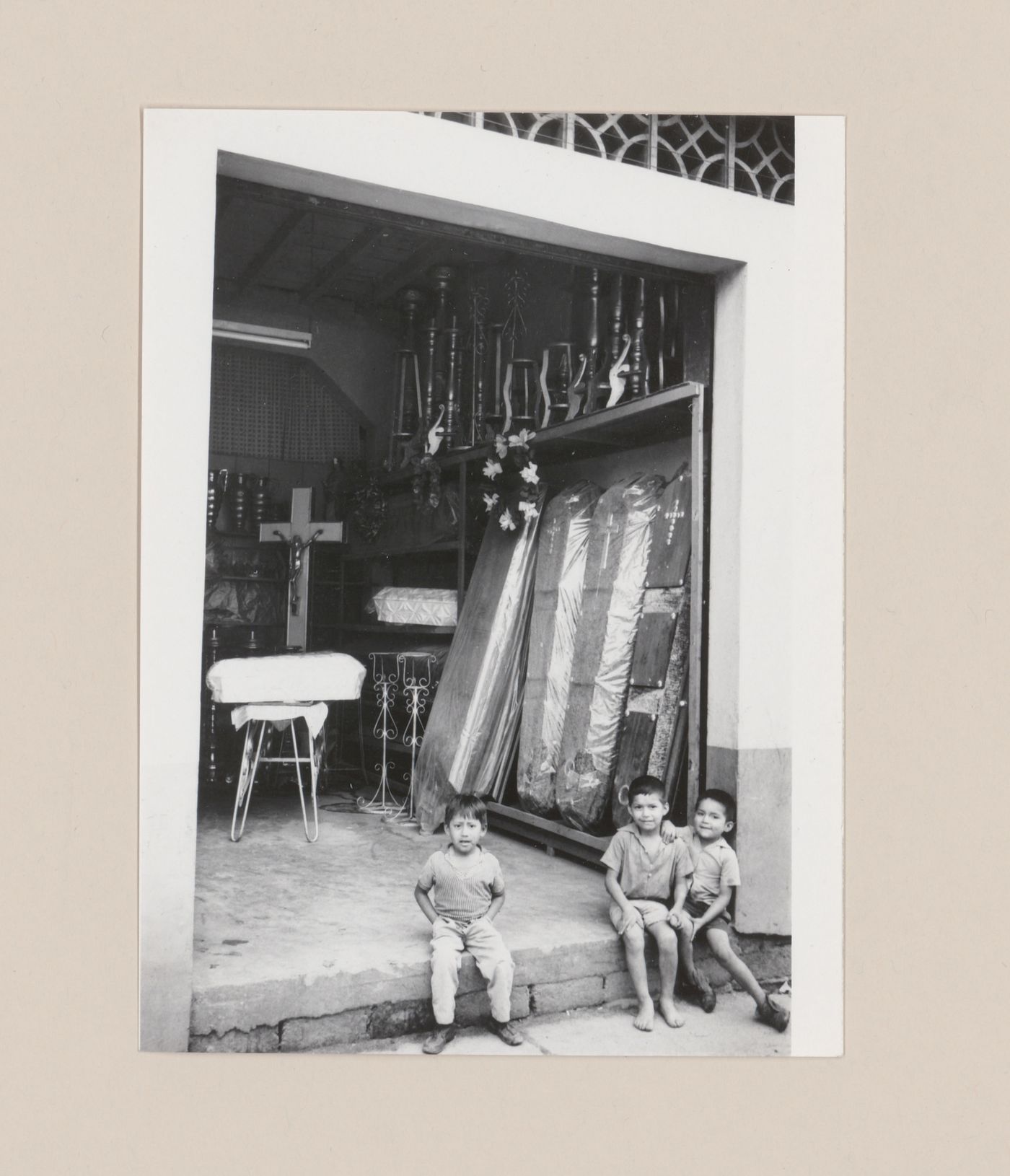 Boys on the doorstep of a storehouse for funerary objects, South America