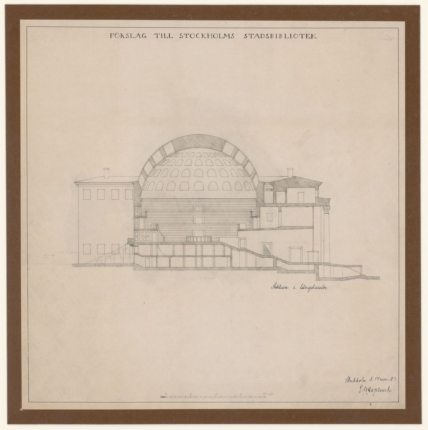 Longitudinal section for Stockholms stadsbibliotek [Stockholm Public Library], Stockholm, Sweden
