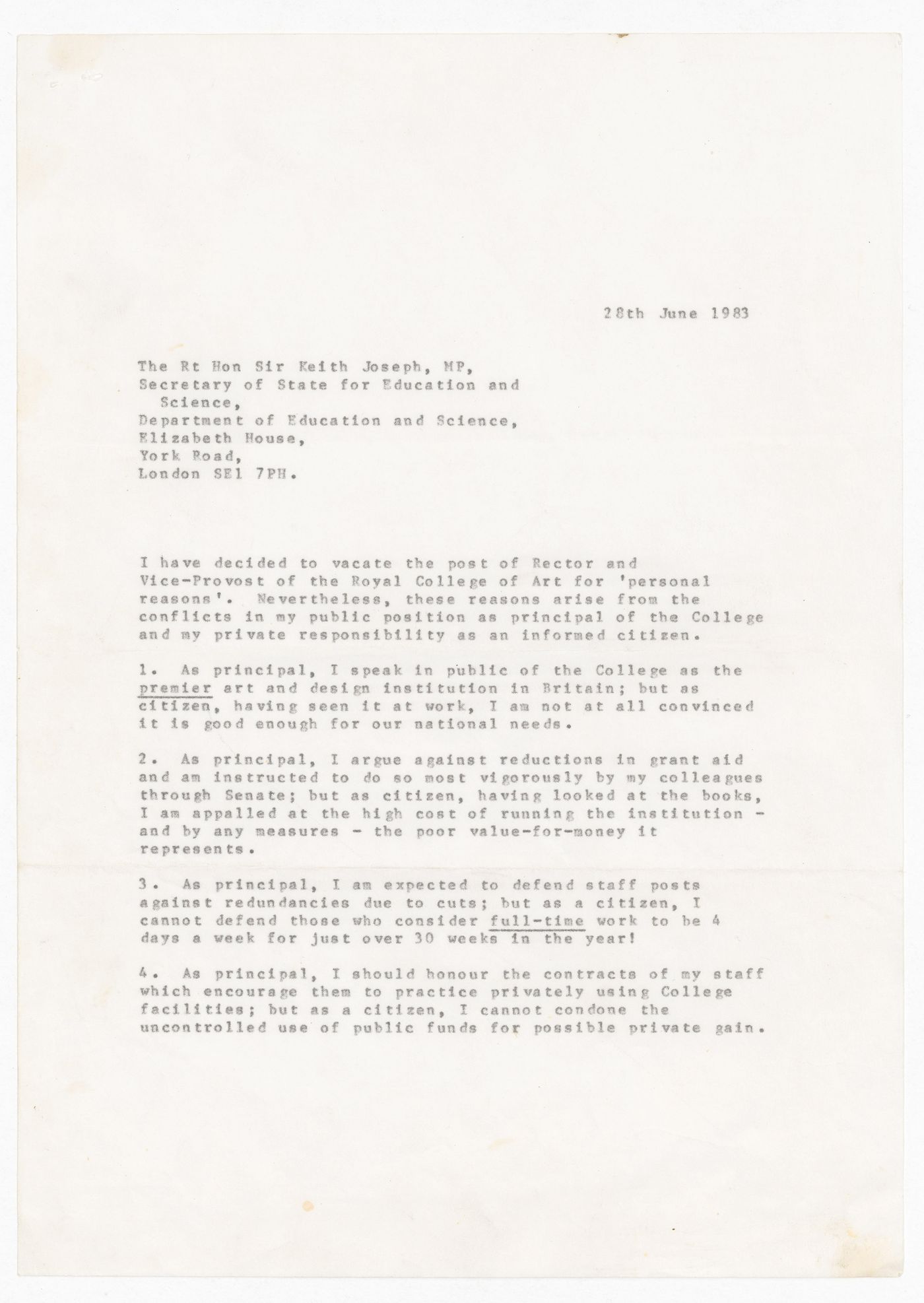Correspondence from Lionel March to Keith Joseph regarding resignation from Royal College of Art, London