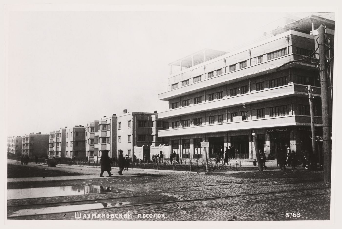 View of a street with housing in the background and a dormitory in the foreground, Armenikend (Shaumian) settlement, Baku, Soviet Union (now in Azerbaijan)