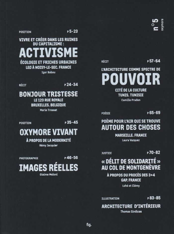 La revue fig. est une revue d'architecture qui ne parle pas seulement d'architecture. C'est un support imprimé qui permet d'expérimenter et d'interroger l'espace, la ville, le paysage, le chantier et l'habiter. Son but est de livrer une critique architecturale innovante, plurielle, graphique et grammaticale, réunissant des positionnements artistiques, littéraires et philosophiques. Ce quatrième numéro de fig. montre quelques possibilités de concevoir d’autres architectures et d’entendre d’autres récits, hors des logiques immobilières et culturelles actuelles essentiellement basées sur la spéculation et la rentabilité, auxquelles on donne encore trop de latitude.