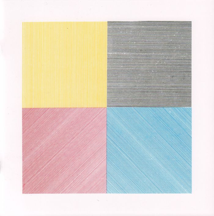 Originally published in 1977, this 34 page staple-bound book is an early example of LeWitt’s rigorous, algorithmic process in which a set of rules is run through its permutations to generate corresponding images. First in overview and then in detail, the publication sets down all possible combinations in overlaying four basic lines (vertical, horizontal, right-facing diagonal, left-facing diagonal) followed by a distinct combinatory system of four basic colors (yellow, black, red, blue). Each spread is composed of these two parallel systems played out one at a time, with escalating line combinations on the left hand side and corresponding color combinations on the right.