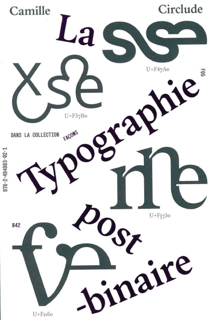 Comment dépasser la binarité de genre caractéristique de la langue française ? Cet ouvrage revient d’abord sur l’apparition des écritures dites inclusives et non-binaires, pour esquisser les prémices d’une approche post-binaire de la typographie. En rappelant la portée politique du dessin de caractères, Camille Circlude montre comment le champ du design typographique offre désormais un espace inédit permettant à l’écriture d’embrasser le vaste prisme des genres, au-delà de la binarité.