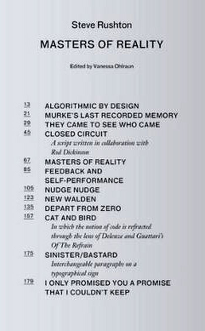 Steve Rushton's research is an investigation into feedback, social control, and the contemporary culture of self performance, developing a thorough analysis of the techniques and processes of information management and subjectivization in Western society since the second half of the twentieth century. This book, second in a series inaugurated by the Piet Zwart Institute, articulates a clear relationship between diverse subjects, drawing from a broad range of archival materials from military experiments in social psychology to works by Don DeLillo and Ant Farm.