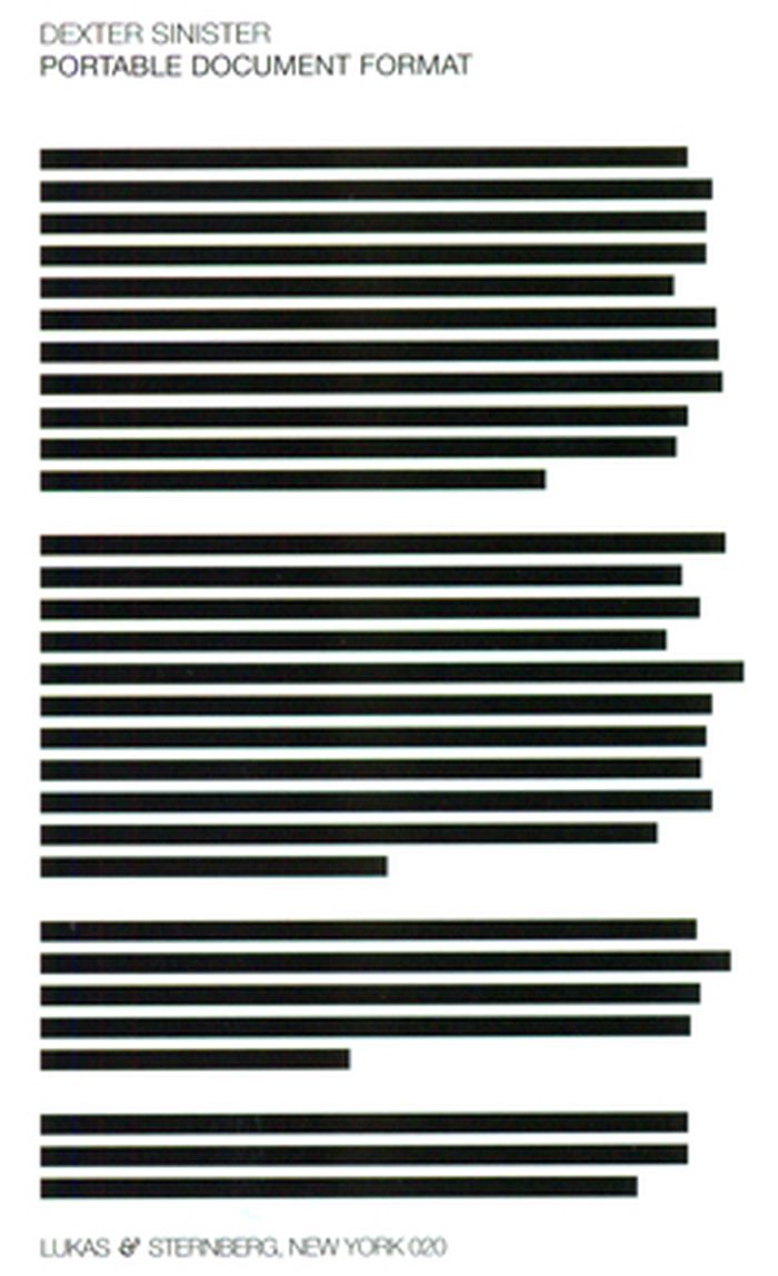 A library is a collection of books kept for use. That axiom is key to this book. Even the title is sly: the portable document format refers both to texts assembled in the library at dextersinister.org, and to this other artifact of technology, a pocket-sized, hardcover book. Includes 13 texts by a variety of writers that investigate contemporary publishing in its broadest sense, stemming from a New York basement workshop and bookstore in 2006. The second part consists of reproductions of a series of 10 images titled W.A.S.T.E. Proof Prints, with their extended captions.