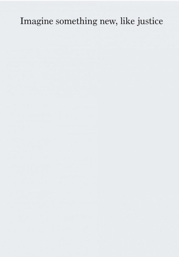 This publication project was realised by the 2019–2021 fellows of the Graduate School programme at the Berlin University of the Arts: Yalda Afsah, Salwa Aleryani, Neslihan Arol, Anthony R. Green, Mariam Mekiwi, Rindon Johnson, and R A Walden. The intricacies of building societal, historical, corporeal, and environmental justices today in theory and praxis make the common denominator among their sonic, visual, filmic, theatrical, literal, sculptural, and installation oriented researches. Intersections, collapses, overlaps and resonances among their voices make this publication a unique artist book that questions the agency of imagination in the artistic, discursive and political realms. Imagine something new, like justice is also an investigation of transdisciplinarity in collective methodology where artist fellows, publisher, designer, editor, and coordinator took steps further their designated labor division roles.