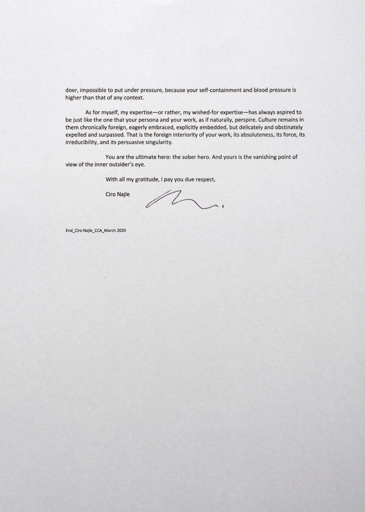 Je me tiens humblement ici, lisant cette lettre à votre mémoire et à son présent absolu (continu). Et pourtant, l’humilité exige que l’on associe à votre profond héroïsme, votre forte volonté d’universalité, votre finesse et votre absolutisme, votre idéalisme paradoxalement objectif, votre désir profondément retenu et pacifique d’extensivité et d’expansion, votre horizontalité immanente et acérée.
