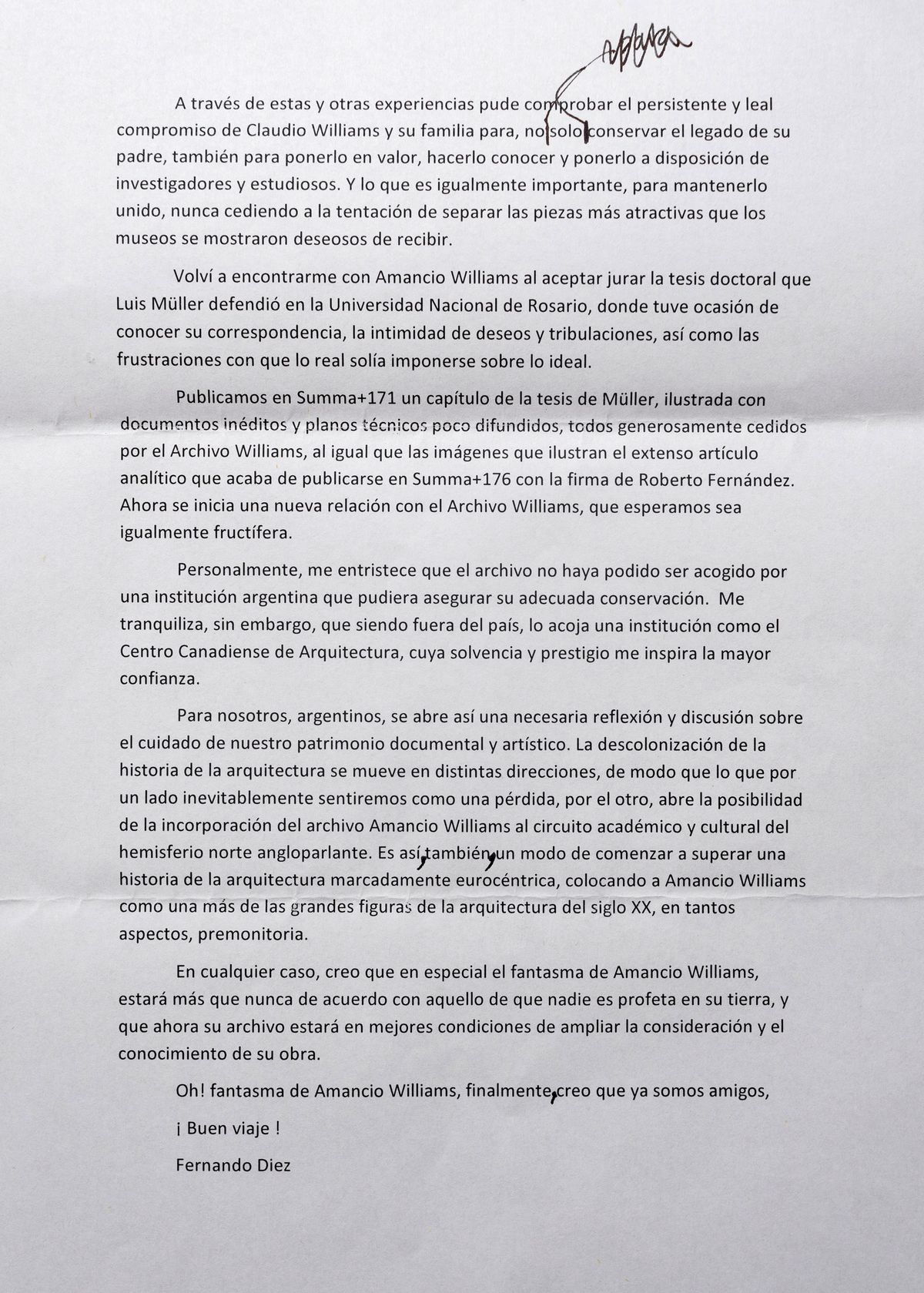 Pour nous, Argentins, s’amorcent une réflexion et une discussion nécessaires sur l’attention portée à notre patrimoine documentaire et artistique. La décolonisation de l’histoire de l’architecture se déplace dans différentes directions, de sorte que ce qui d’un côté paraîtra inévitablement comme une défaite, ouvrira de l’autre la possibilité de l’incorporation du fonds d’archives Amancio Williams au circuit universitaire et culturel de l’hémisphère nord anglophone. Cela permet également d’entamer le dépassement d’une histoire de l’architecture résolument eurocentrique, donnant ainsi à Amancio Williams, une des grandes figures de l’architecture du XXe siècle, un aspect prémonitoire.