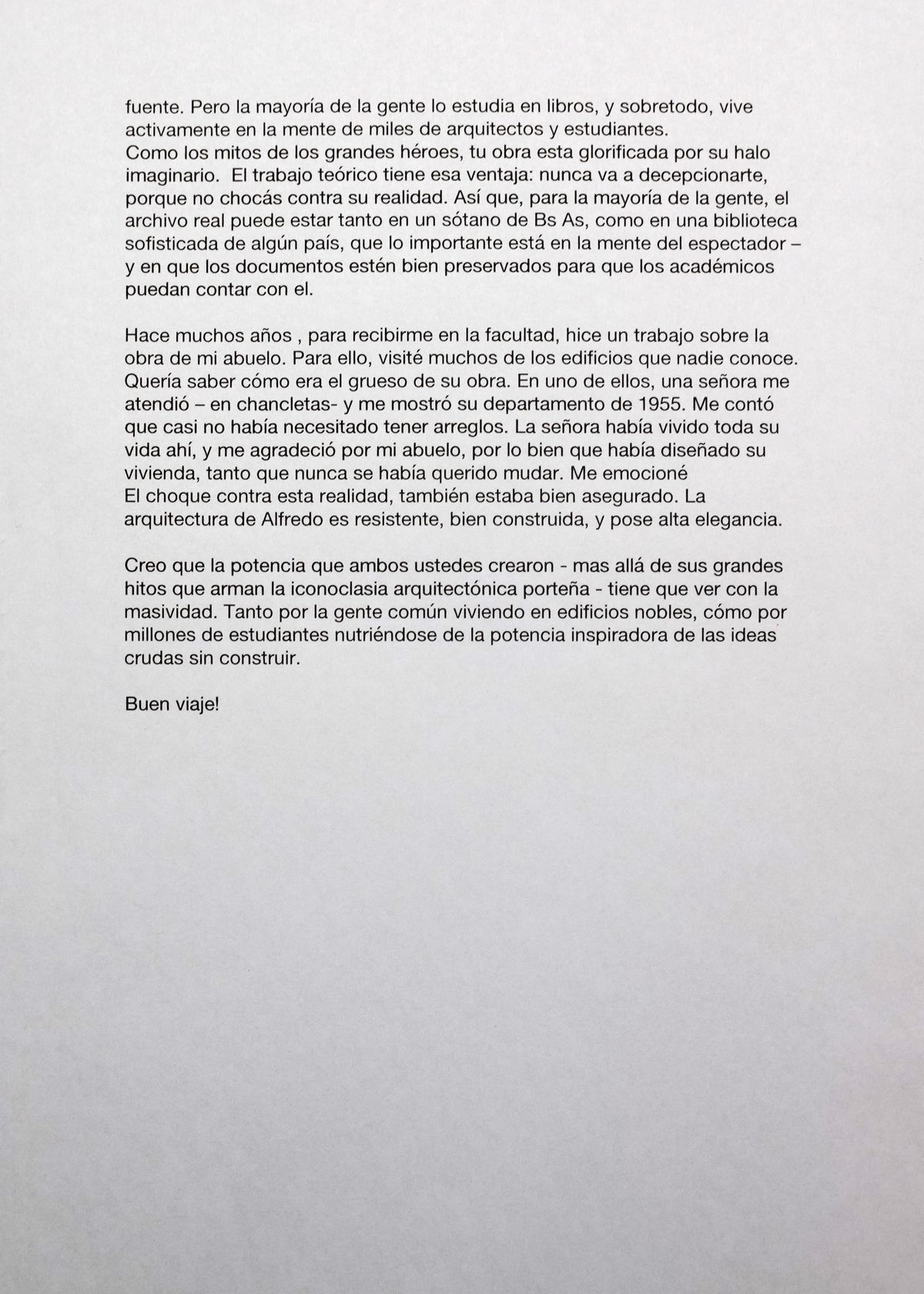 Je crois que la puissance que vous avez tous deux créée – bien au-delà de vos événements marquants qui arment l’iconoclasme architectural de Buenos Aires – tient de la massivité. Tant pour les gens ordinaires qui vivent dans des édifices nobles, que pour les millions d’étudiants qui se nourrissent de la puissance inspiratrice des idées brutes sans construire.