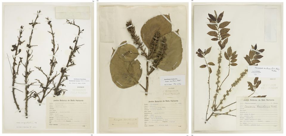 Henrique Lahmeyer de Mello Barreto. Flore native du Minas Gerais (sélection basée sur les espèces identifiées dans l’étude environnementale de Flor de Café, près de Nepomuceno), vers 1935. Avec l’aimable autorisation de The Field Museum, Chicago. De gauche à droite : Machaerium hirtum, Roupala montana, Casearia arborea
