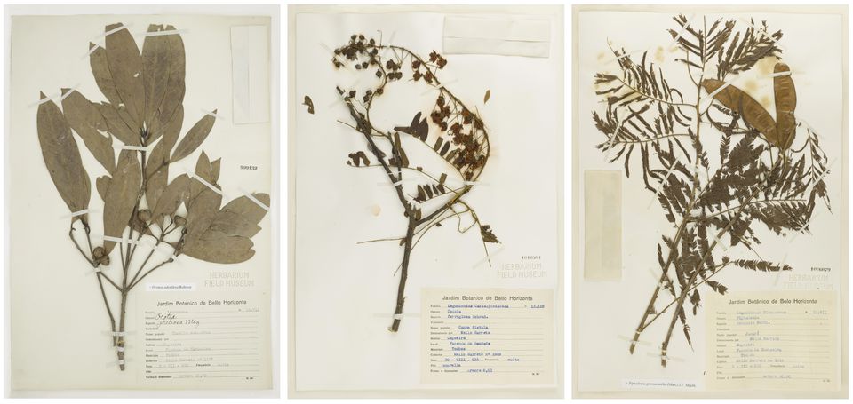 Henrique Lahmeyer de Mello Barreto. Flore native du Minas Gerais (sélection basée sur les espèces identifiées dans l’étude environnementale de Flor de Café, près de Nepomuceno), vers 1935. Avec l’aimable autorisation de The Field Museum, Chicago. De gauche à droite : Ocotea odorifera Rohwer, Cassia ferruginea Schrad., Piptadenia gonoacantha