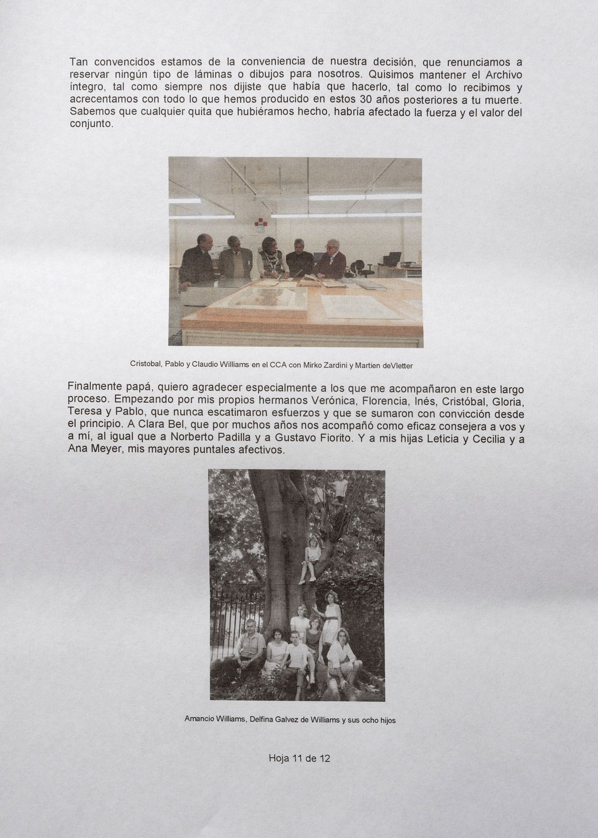 Delfina Gálvez de Williams, ton épouse et notre mère, s’est également avérée être d’un précieux secours dans ton travail et dans le développement de tes relations. Elle t’a accompagné pendant tes premières années comme architecte, en travaillant à tes côtés, et tout au long de ta vie en te faisant bénéficier de sa culture et de sa loyauté. Elle a aussi exercé une forte influence sur tes collaborateurs, presque tous devenus des amis par la suite, non seulement les vôtres, mais également ceux de vos huit enfants. Les liens d’amitié et de solidarité que nous entretenons maintenant avec eux sont la conséquence directe de l’empathie de maman, qui leur ouvrit les portes de la maison en les intégrant à la vie familiale.
