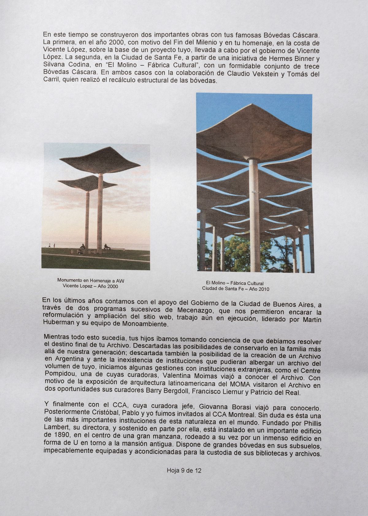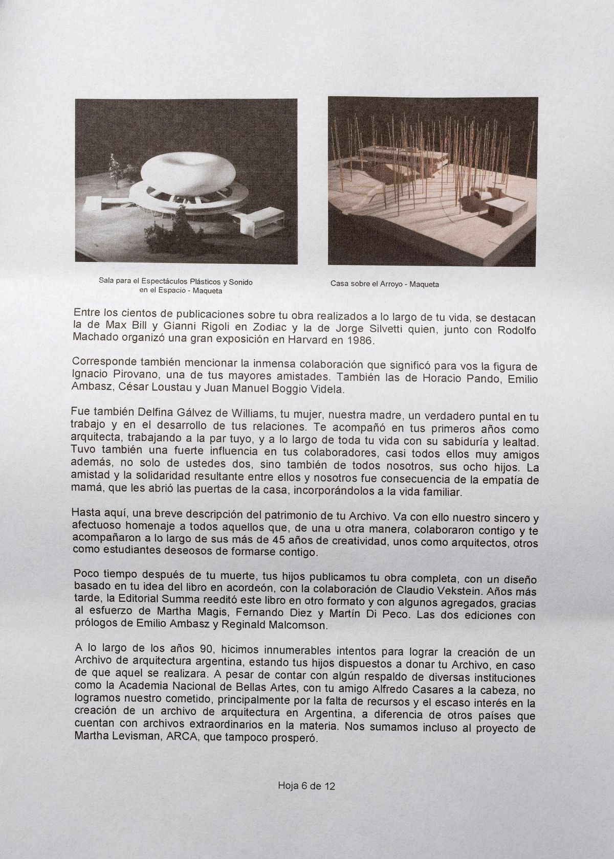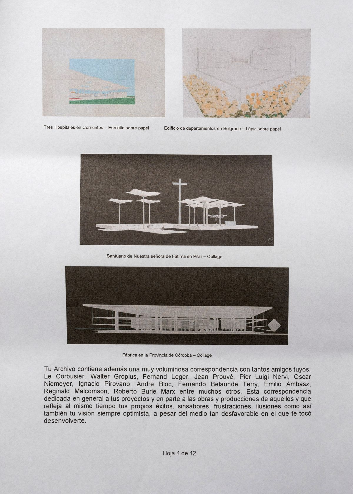 Au cours des années 90, nous avons fait d’innombrables tentatives pour créer un fonds d’archives d’architecture argentin, puisque tes enfants étaient disposés à léguer tes archives, si l’occasion se présentait. Malgré l’appui de diverses institutions, comme l’Academia Nacional de Bellas Artes, dirigée par ton ami Alfredo Casares, nous n’avons pas atteint notre objectif, principalement par manque de ressources et à cause du faible intérêt envers la création d’un fonds d’archives d’architecture en Argentine, à la différence d’autres pays, qui bénéficient d’archives extraordinaires en la matière. Nous avons aussi participé au projet de Martha Levisman, (ARCA, Archivo de Arquitectura Contemporánea Argentina), qui n’a pas fonctionné non plus.