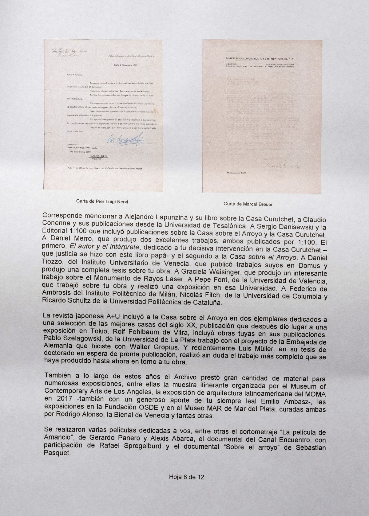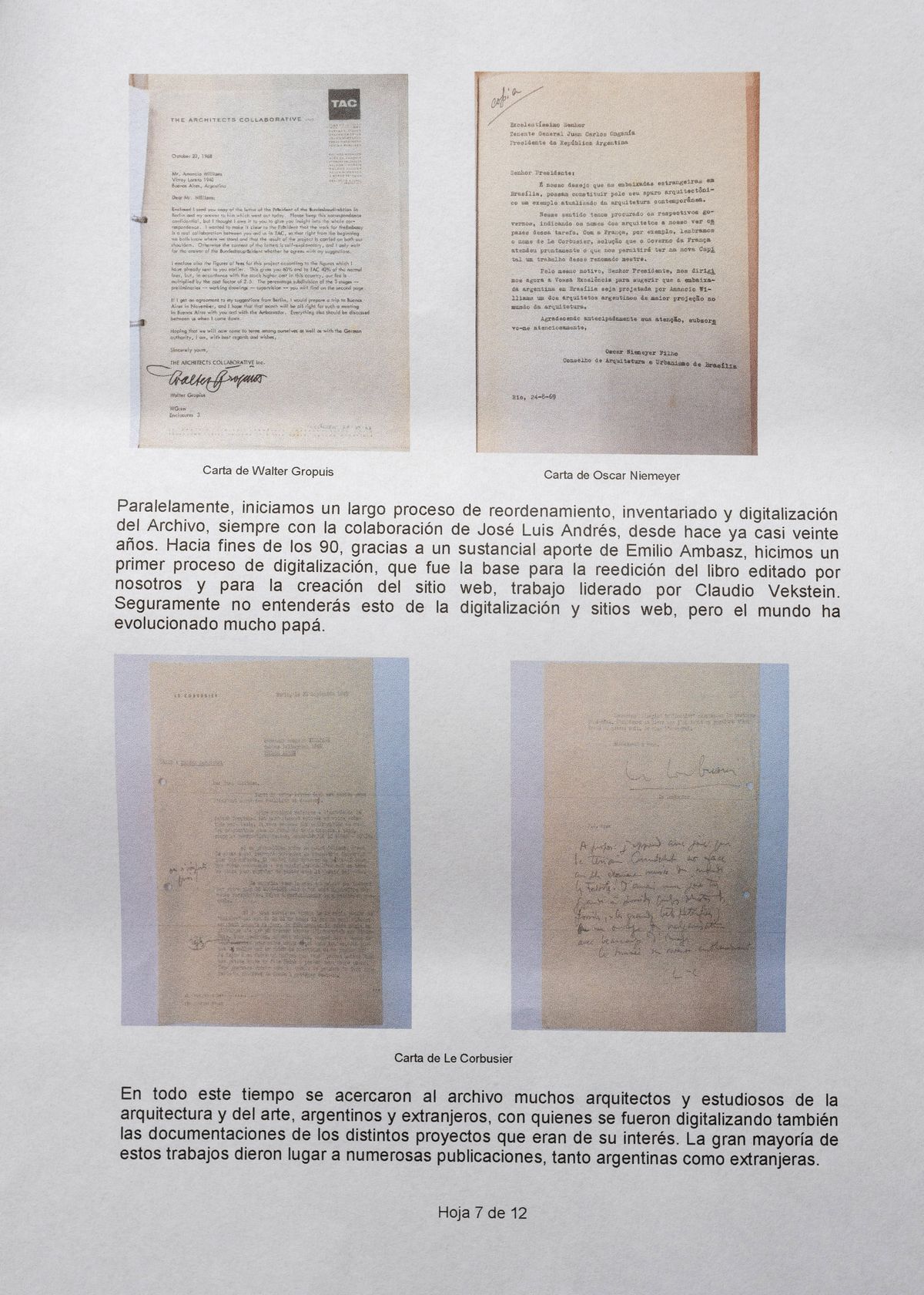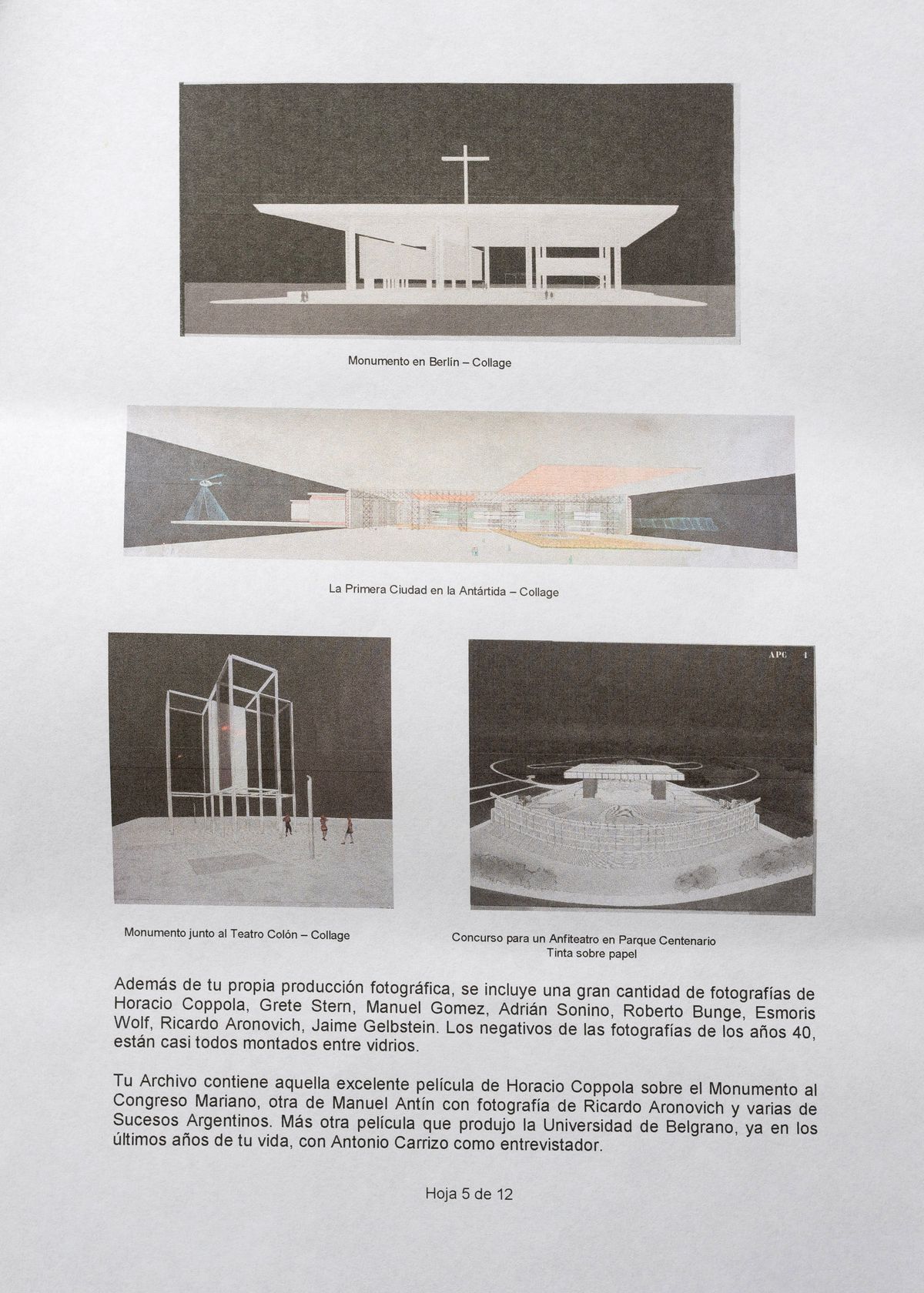 Au cours des années 90, nous avons fait d’innombrables tentatives pour créer un fonds d’archives d’architecture argentin, puisque tes enfants étaient disposés à léguer tes archives, si l’occasion se présentait. Malgré l’appui de diverses institutions, comme l’Academia Nacional de Bellas Artes, dirigée par ton ami Alfredo Casares, nous n’avons pas atteint notre objectif, principalement par manque de ressources et à cause du faible intérêt envers la création d’un fonds d’archives d’architecture en Argentine, à la différence d’autres pays, qui bénéficient d’archives extraordinaires en la matière. Nous avons aussi participé au projet de Martha Levisman, (ARCA, Archivo de Arquitectura Contemporánea Argentina), qui n’a pas fonctionné non plus.