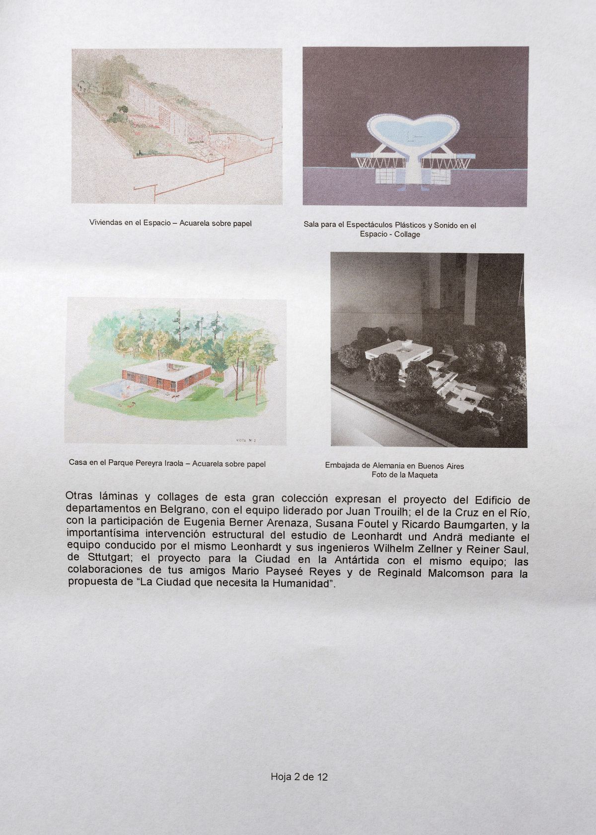 D’autres planches et collages de cette admirable collection illustrent le projet de l’immeuble à appartements à Belgrano, avec l’équipe menée par Juan Trouilh; celui de la croix dans le fleuve, avec la participation de Eugenia Berner Arenaza, Susana Foutel et Ricardo Baumgarten, et la cruciale intervention structurelle de l’étude Leonhardt und Andrä, grâce à l’équipe menée par le même Leonhardt et ses ingénieurs Wilhelm Zellner et Reiner Saul, de Stuttgart; le projet pour la ville dans l’Antarctique argentine avec la même équipe; les collaborations de tes amis Mario Payssé Reyes et Reginald Malcomson pour la proposition de « La ville dont l’humanité a besoin ».