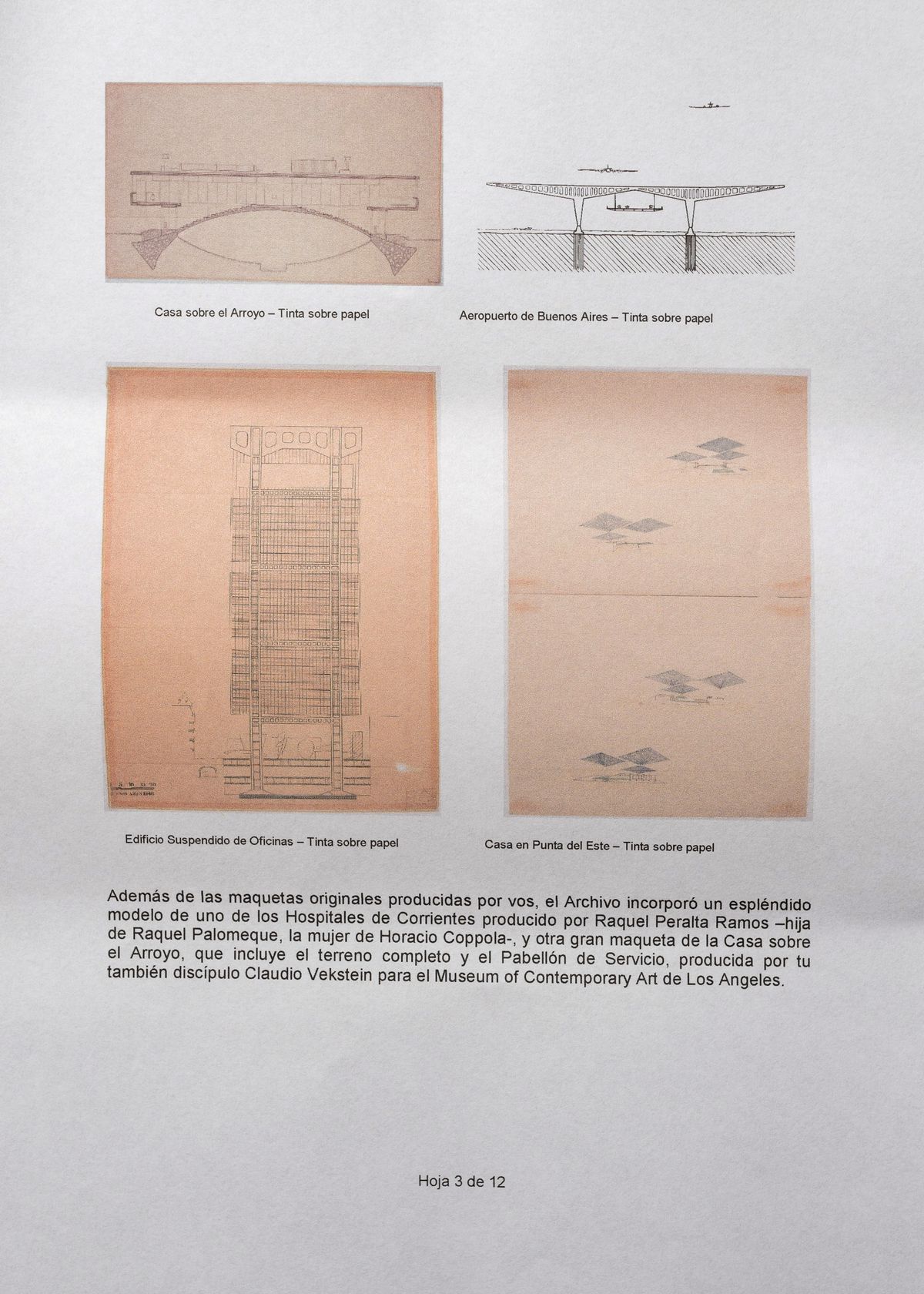 Parmi les principaux jeux de planches que tu nous as laissés, soulignons les plans de la Maison sur le ruisseau, auxquels Delfina, ton épouse et notre mère, a fortement contribué; ceux des Logements dans l’espace, qui incluent des planches dessinées par maman; ceux de l’Édifice à bureaux suspendu, auxquels ont contribué César Janello, Colette Boccara et Jorge Butler; les formidables collages de la Salle de spectacles plastiques et de son dans l’espace; les images de la Maison dans le parc Pereyra Iraola, également faites par maman; les plans des hôpitaux de la province de Corrientes, avec l’intervention de Jaco Saal et de Helvidia Toscano, qui incluent des perspectives remarquables peintes à l’émail par cette architecte; les travaux du début des années 60, avec l’intervention d’Emilio Ambasz et de Norberto Benvenuto, étudiants à l’époque; les splendides collages de grande taille qui illustrent les divers projets des voûtes pelure, réalisés par différentes applications, avec la participation de Luis Santos, Norberto Steindl, Eduardo Leston et Santiago Bonfanti; le projet pour l’église à Berlin et l’usine Igam, également avec de grands collages.