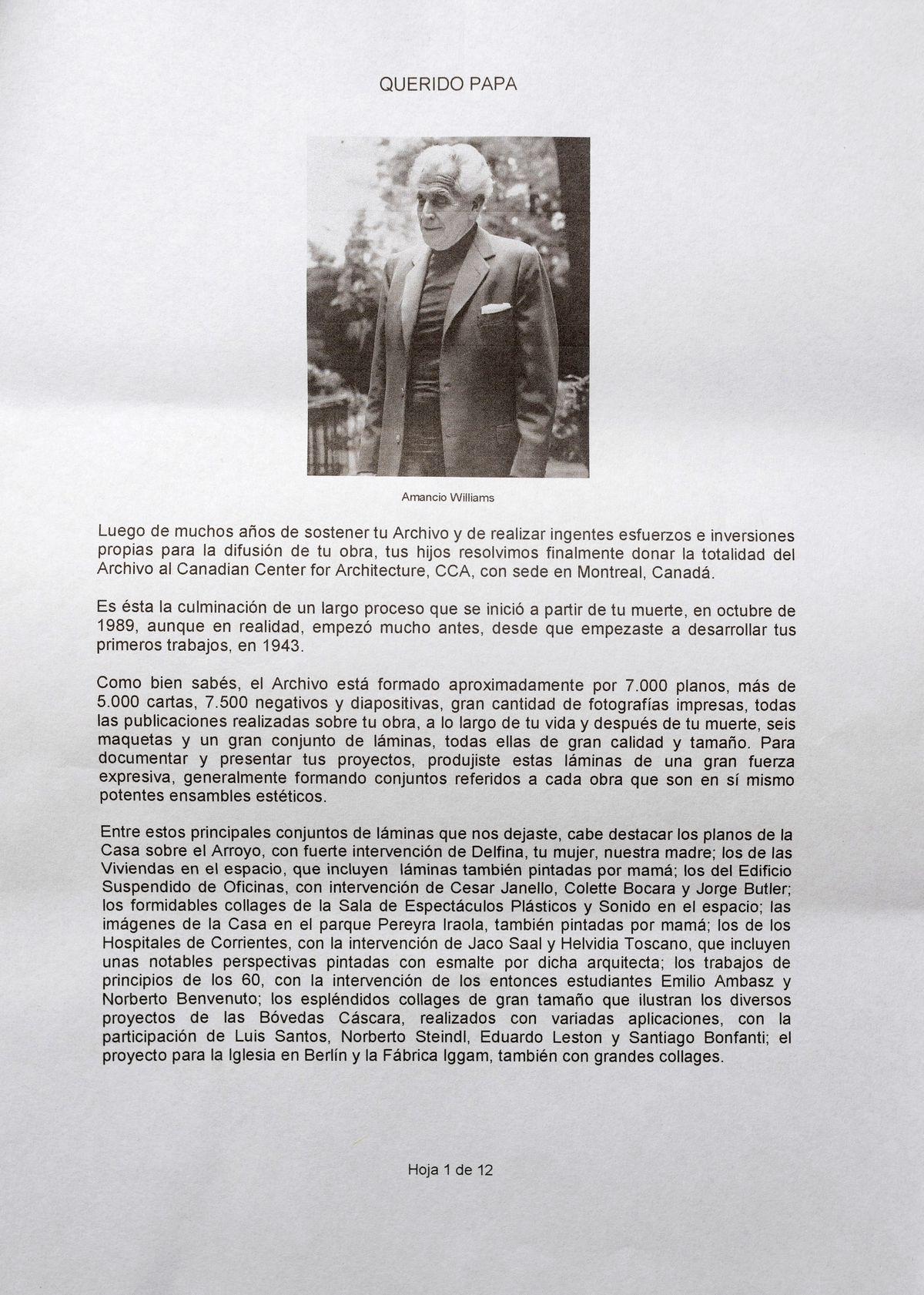 « Permettez-moi de rappeler deux ou trois choses de ce grand homme. D’abord, sa persistance et sa détermination dans la création et l’innovation. Il ne craignait ni le changement ni l’avenir. Il savait saisir la quintessence de la tradition et lui imprimer un nouveau souffle. Dans une société comme la nôtre, assez timorée envers ce genre de choses, l’impossibilité de nier l’autorité et la hiérarchie de la créativité et de l’innovation se cristallisa dans le mot « utopie ». Parce qu’avec le mot « utopie », on peut neutraliser les effets favorables de l’innovation. Le mot « utopie » nous propulse dans le siècle suivant. Le deuxième élément, qui suit la consolidation du respect par la créativité et l’innovation, en la neutralisant pour en faire une « utopie », est la « sacralisation ». Et cette sacralisation a engendré de la frustration. Parce que c’était si sacré que c’était irréalisable. C’était si utopique que ce n’était pas de notre temps. Amancio Williams était si innovateur que les gens craignaient ses projets. La troisième vertu que je souhaite souligner, c’est sa générosité à penser de façon permanente à des projets pour la collectivité, a fortiori quand il a vu que la fin de sa vie approchait, très sacrée, très primée, très utopique, mais très peu mise en action. Au-delà des hommages et de la sacralisation, il serait peut-être bon de ranimer le débat et de se mettre sous les yeux les projets d’Amancio Williams, afin de voir si le temps est venu de considérer son utopie comme la normalité ».