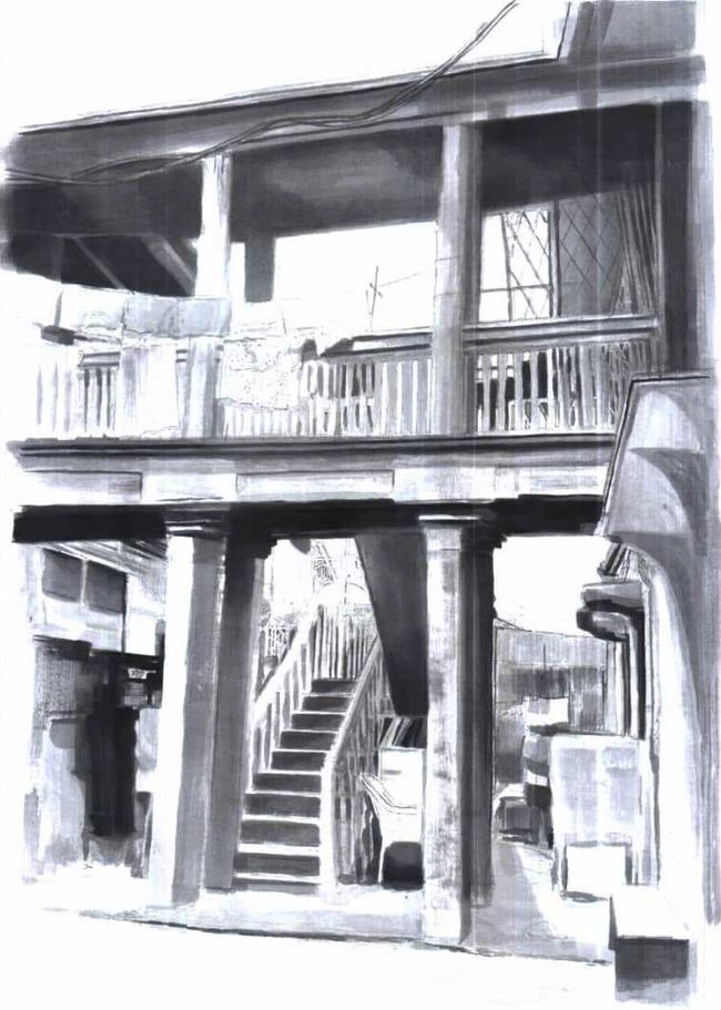 De même, le croquis permet de saisir les perspectives postcoloniales en mouvement en agissant comme un outil de documentation, d’interprétation et d’analyse. Ainsi, le croquis ci-dessus a été initialement produit lors d’un travail de terrain dans le quartier historique de Port Harcourt Township. Le bâtiment au premier plan, construit en 1948, est un exemple précoce d’une construction résidentielle qui incorpore un commerce à domicile – dans ce cas, un magasin de proximité – situé dans un espace de rez-de-chaussée ouvert, avec généralement une salle de séjour et des chambres attenantes à l’étage, ainsi qu’une cuisine et des toilettes indépendantes. Cordelia Osasona, une éminente spécialiste nigériane du patrimoine et de l’architecture vernaculaire, attribue ce type de bâtiment aux influences des premiers immigrants « Saro » (Sierra-Léonais) à Lagos1. Deux autres exemples de bâtiments résidentiels historiques de Port Harcourt Township conçus avec des entreprises locales comprennent un bureau d’architecture et une blanchisserie. Le croquis de la maison avec commerce de proximité tente de dépeindre le sentiment de fierté que le bâtiment personnifie et la position importante qu’il occupe parmi les habitations environnantes, ainsi que l’expérience vécue au quotidien dans le quartier. Bien qu’exécuté dans un style réaliste contemporain, le croquis laisse intentionnellement de côté les personnes, faisant du bâtiment le protagoniste. Ce faisant, il positionne le croquis comme l’outil d’un conteur qui dirige l’intrigue, en choisissant les angles de vue des expériences, les événements, les détails et les récits sur lesquels se concentrer, ce qui doit être estompé et ce qui doit être mis en évidence – en d’autres termes, comment représenter visuellement et interpréter un récit.
