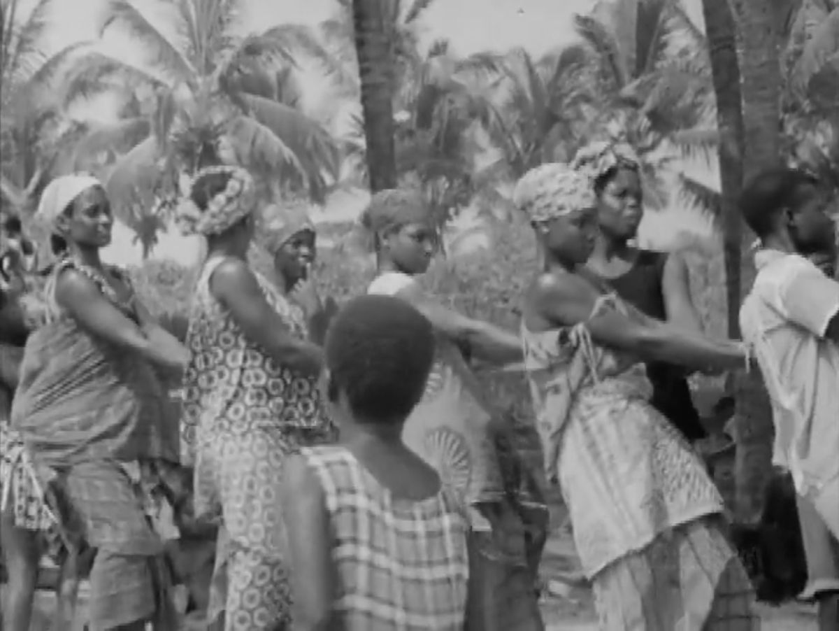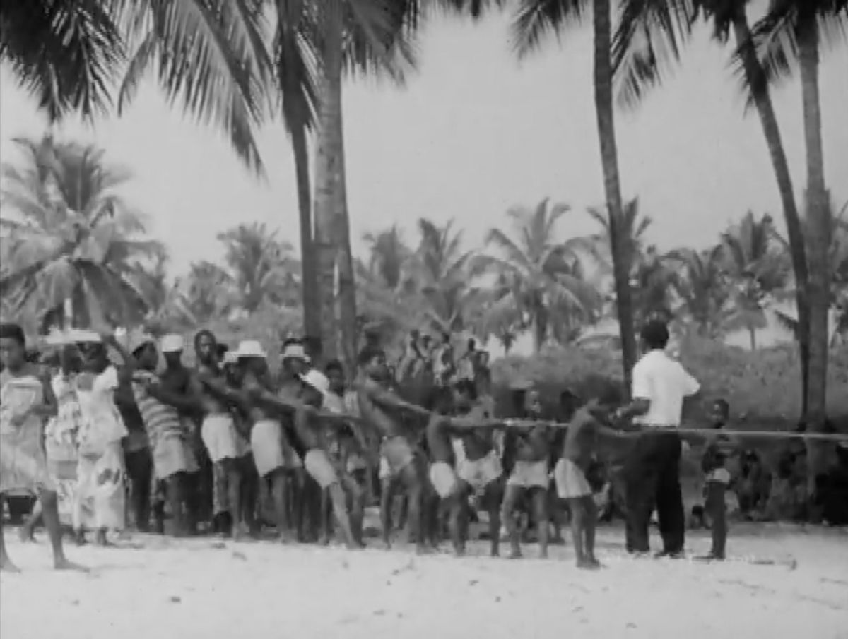 Alors que le son métallique et rythmé des cloches de vache se mêle au grondement récurrent du ressac des vagues, une voix mélodique s’élève en guise d’appel et un choeur de sonorités profondes et ondoyantes lui répond dans un chant harmonique. Ainsi le veut la tradition vocale polyphonique d’une communauté de pêcheurs ghanéens, filmée en 1964 sur une plage à soixante kilomètres à l’est d’Accra. Le film montre un groupe d’une trentaine de personnes oeuvrant de concert pour ramener leur filet de pêche sur le rivage1. Alors que les cloches retentissent et que le chant mélodieux se poursuit, le groupe de pêcheurs marche lentement à reculons, en tirant sur une seule corde qui se déploie dans la baie et qui tour à tour monte vers le ciel puis redescend, imprimant à leur démarche un rebondissement collectif. Vêtus de shorts blancs et de chapeaux fedora, le plus souvent torse nu, les hommes et les garçons semblent former un corps unique pourvu de soixante bras et soixante jambes reliés par une seule corde. À mesure que se déroule le film, des femmes vêtues de pagnes et de robes en tissu d’importation imprimé s’emparent de la corde et prêtent leur force à ce tir à la corde en bord de mer2. Les derniers plans montrent les membres de la communauté en train de se partager la prise; certains poissons seront mangés collectivement et le reste sera vendu au marché.