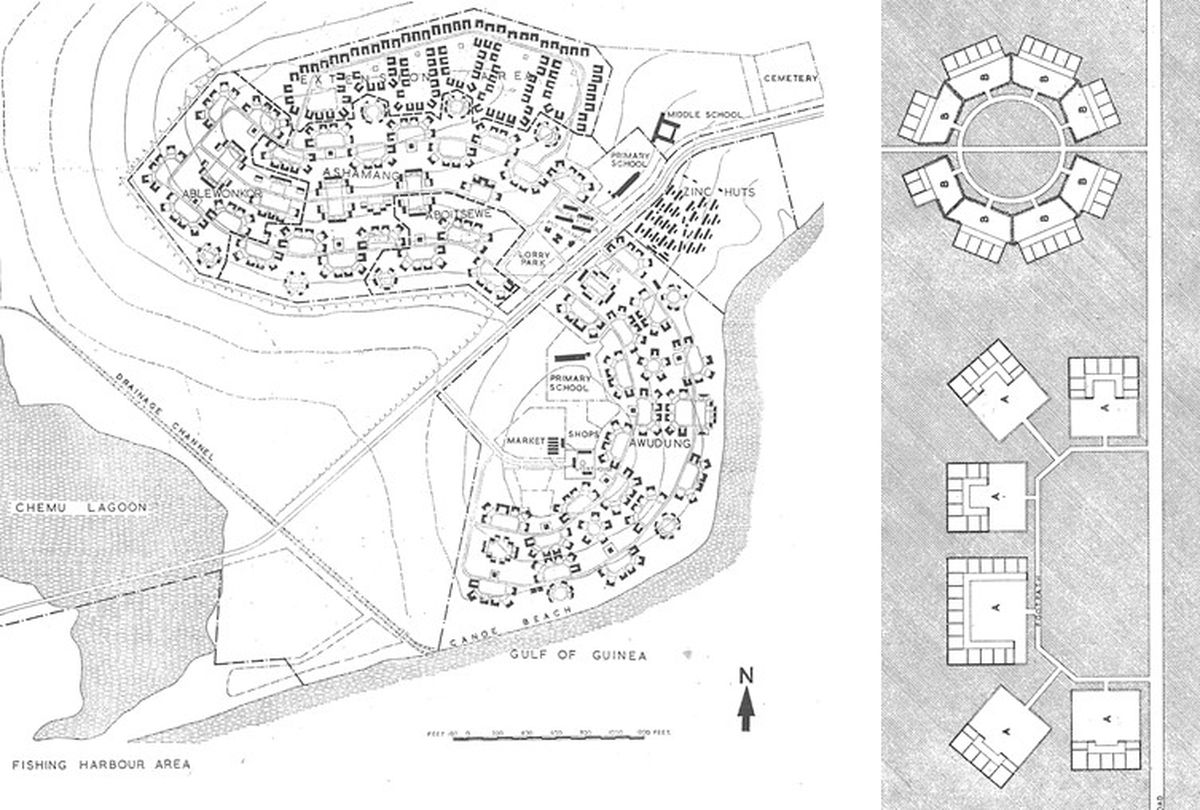 Parallèlement au développement du port, Tema New Town (la ville moderne de Tema) a été conçue à la fois pour reloger le village de pêcheurs déplacé et pour créer des logements adaptés à une société africaine moderne et indépendante. Le plan directeur était une démonstration de la manière dont un modèle urbain moderniste pouvait être, en théorie, importé en Afrique par les Européens. Élaborés par Alfred Alcock, Maxwell Fry et Jane Drew, les plans initiaux ont transposé le modèle du « new town » anglais sur le continent, donnant naissance au lotissement connu sous le nom de Tema Manhean. En 1960 cependant, frustré par la lenteur des progrès, Nkrumah a fait appel à l’urbaniste grec Constantinos Doxiadis pour élaborer un plan directeur encore plus efficace1. Les archives architecturales du projet du port et de la ville moderne de Tema privilégient donc largement ces perspectives européennes. Les dessins et les journaux de Fry et Drew couvrent le développement initial de la conception à la fin de la période coloniale, tandis que ceux de Doxiadis couvrent les stratégies de conception développées dans les années qui ont suivi l’indépendance. Si les archives de Fry et Drew contiennent des comptes rendus détaillés de leurs vies, leurs relations et leurs aspirations, on y trouve relativement peu de réflexions sur les points de vue des personnes pour lesquelles ils concevaient leurs projets. De même, les archives de Doxiadis livrent de nombreux détails techniques sur la stratégie de conception et les progrès réalisés, tandis que la correspondance tendue avec l’administration de Nkrumah ne donne qu’une brève idée des perspectives locales. Bien que les deux firmes aient fait référence à des typologies locales dans leurs plans, les archives n’offrent qu’une vue historique autonome, presque singulière, et présentent le récit de la conception de l’architecture comme un exercice linéaire visant à répondre à un cahier des charges qui, dans ce cas, a exclu les complexités culturelles du contexte dont cette architecture est issue2.