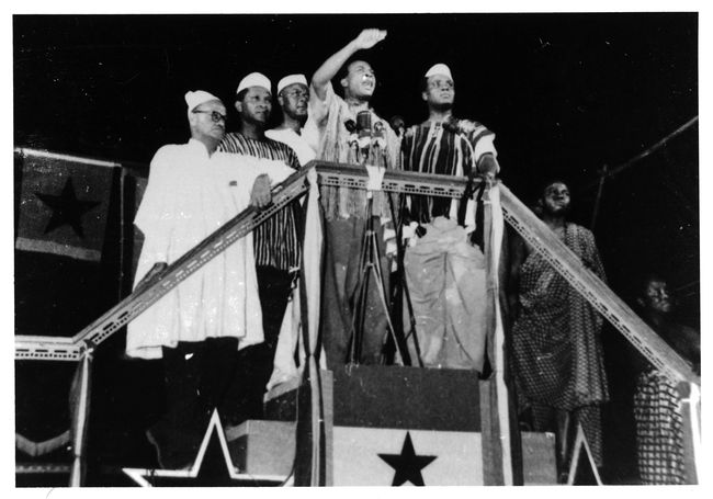 Kwame Nkrumah annonçant l’indépendance du Ghana, le 6 mars 1957. Nkrumah oblige les Ghanéens à adopter une « personnalité africaine », entouré du symbole de l’étoile noire et portant la robe traditionnelle du fugu qu’il approuvera plus tard comme tenue nationale. Image tirée de Nate Plageman, « The African Personality Dances Highlife », 2014. Gracieuseté de Nate Plageman © Information Services Department of Ghana Photograph Library